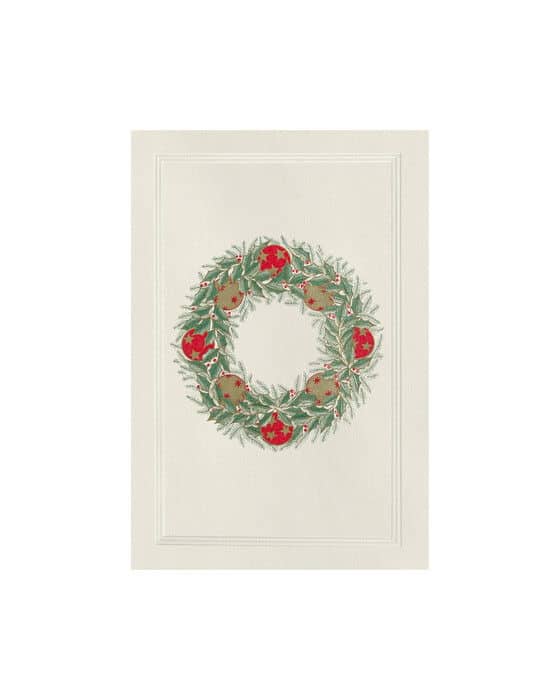 En stilfuld julehilsen med klassisk symbolik. Dette elegante kort er prydet af en vintergrøn krans dekoreret med røde julekugler og subtile detaljer i guld og hvidt. Den prægede ramme giver et eksklusivt indtryk, et tidløst valg til en inderlig og smuk julehilsen.