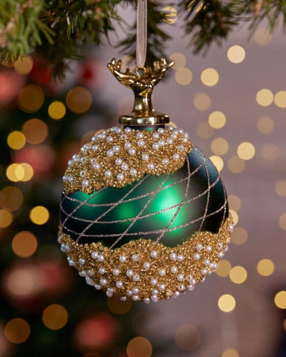 Løft juletræets pynt med Cornell julekugle i dybgrønt glas, smukt dekoreret med glitrende perler og skinnende gulddetaljer. De sirligt tegnede sølvlinier danner et elegant mønster, der fremhæver kuglens sofistikerede udtryk. En pragtfuld dekoration, der kombinerer klassiske farver med luksuriøse detaljer og bliver et strålende midtpunkt i juletræet.Noble Collection samler julekugler, der kombinerer tidløs elegance med en følelse af højtidelig pragt. Med unikke mønstre, luksuriøse detaljer og klassisk håndværk bliver hver kugle en dekoration, der løfter juletræet til noget helt særligt. En kollektion skabt til at sprede julestemning og blive en naturlig del af traditionen år efter år.