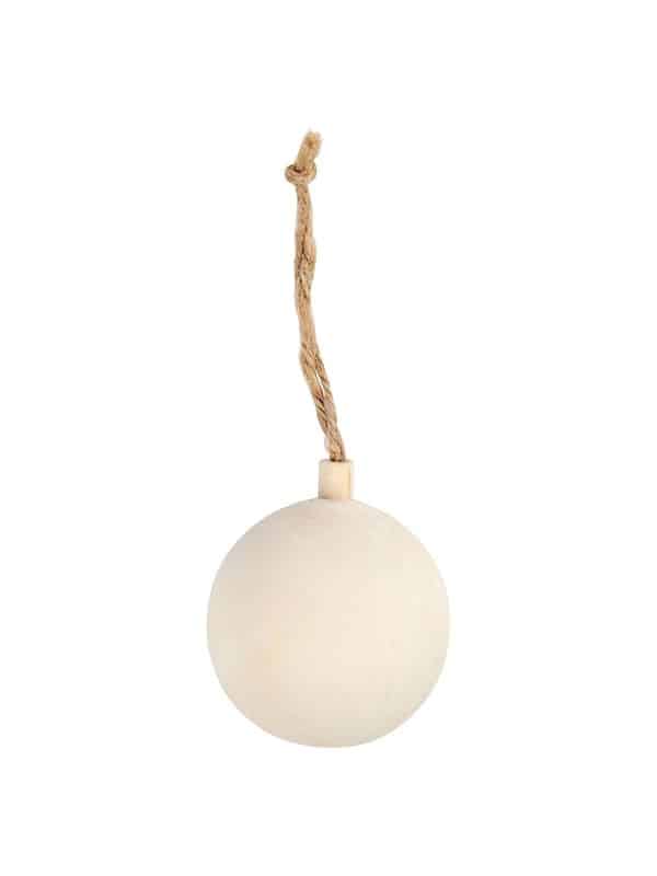 Julekugle i træ med vedhæng. Bolden har en diameter på 5,5 centimeter.