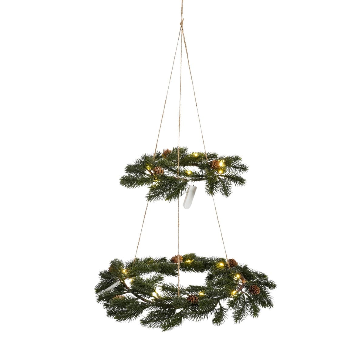 Grankranse med to ringe i ophæng pyntet med 17 led-lys. Kransene kan dekoreres med alt fra engle til julekugler. Meget dekorative med eller uden pynt. Mål:Diameter: 42 cm (største krans)Højde: 60 cmBruger knapcellebatterier. Fremstillet i polyethylen.Pakk