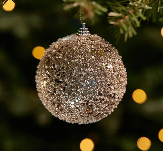 En funklende julekugle i farven champagne, der glitrer flot på træet. Julekuglens små perler skaber både lys og elegance. Tilføj gerne flere julekugler og dekorationer for at skabe en magisk julestemning.