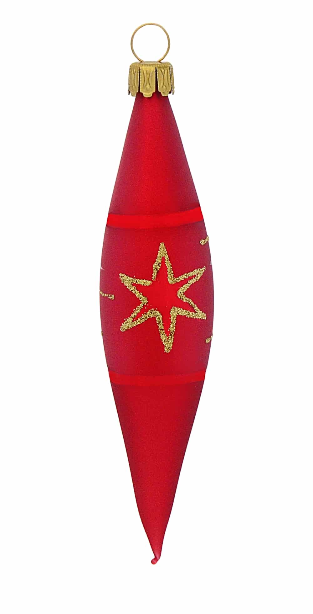 Smukke julekugler med aflang form i mat, rød nuance med stjernemotiv. Julekuglen er mundblæst og håndmalet hos det sydtyske glaspusteri Thüringer Weinacht.Mål:Højde: 12 cmFremstillet af glas.Pakket med 5 stk. i en æske.