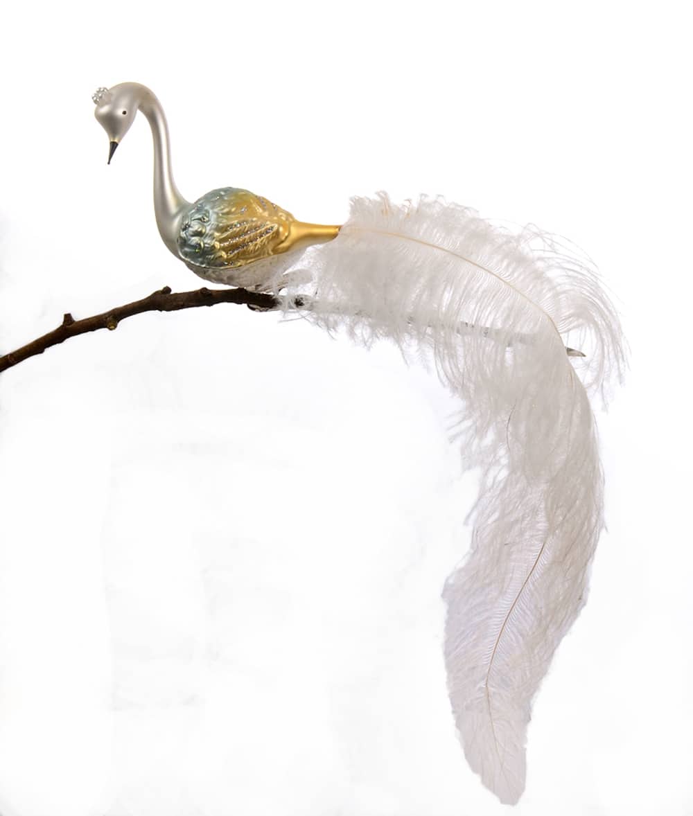 Denne enestående halsfugl i glas er et sandt samlerstykke og en af de mest eksklusive fugle fra Thüringer Weihnachten Glasbläserei. Fuglen er mundblæst og håndmalet af dygtige glaskunstnere, og hver detalje er udført med en præcision og elegance, der plac