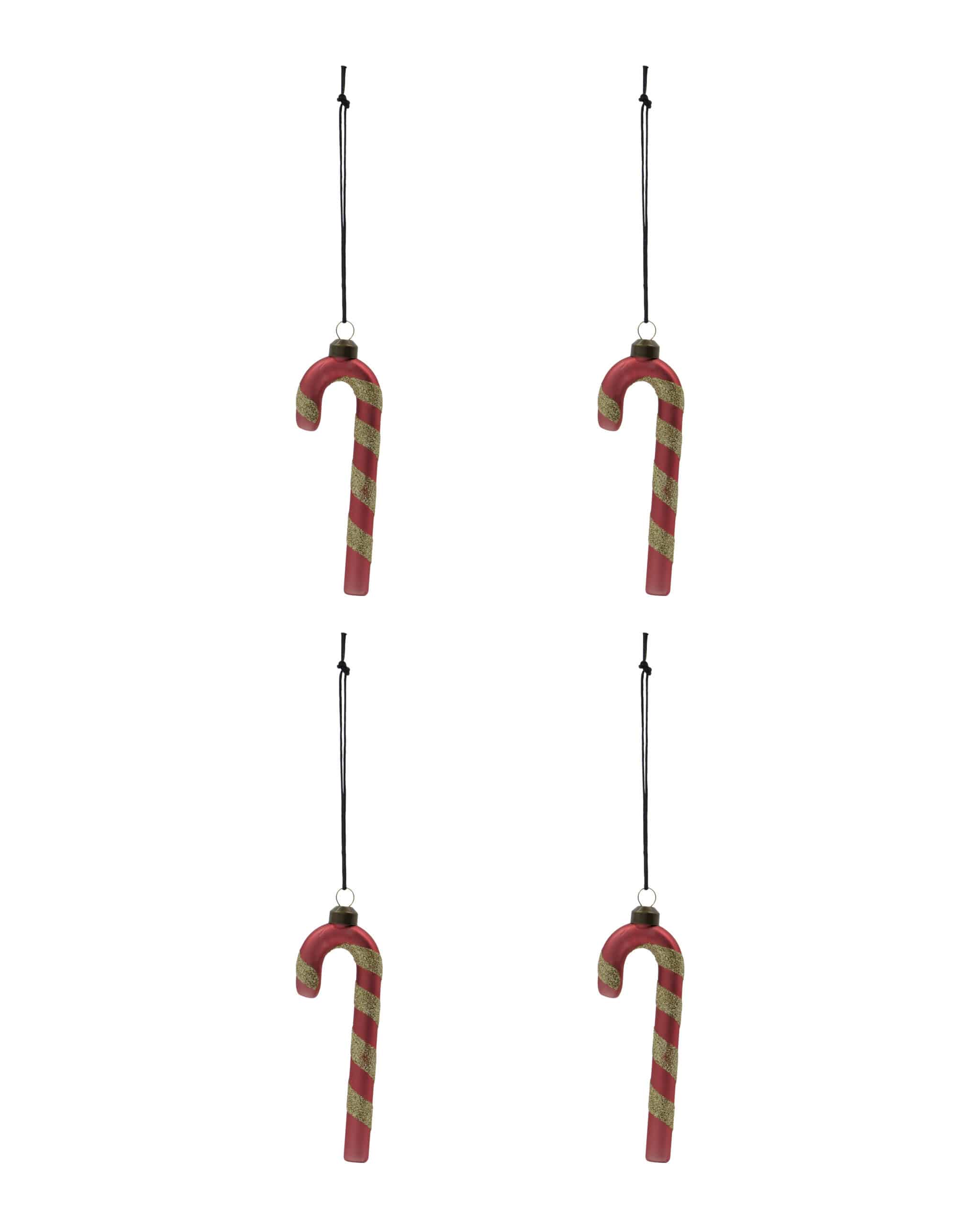 Disse julekugler i form af sukkerstænger er fremstillet af rødt glas med gulddetaljer og har en slank, aflang form. Hvert stykke er færdiggjort med en jernplade og en løkke, så det er nemt at hænge op. Sættet indeholder fire dele.Sæt med 4 stk.Lavet af gl