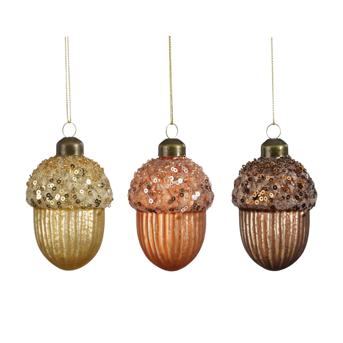 Julekugle agern i farverne champagne, kobber eller brunt. Agernet er med glimtende top med pailletter på. Julekuglerne er flotte på fx juletræet, som vinduespynt eller som en del af efterårspynten. De kan også pynte liggende på et fad eller i en skål.Mål: