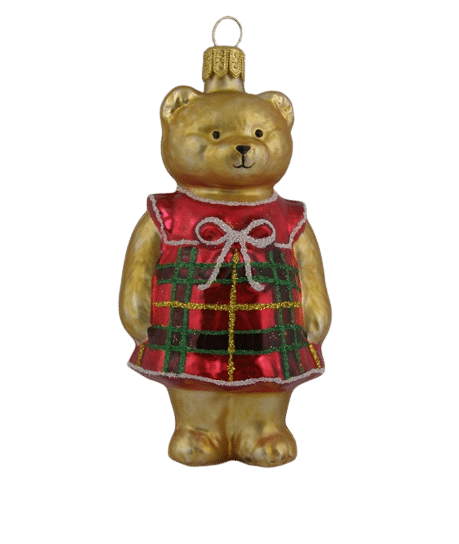 Detaljerig julekugle, der forestiller bamsemor med ternet kjole. Julekuglen er mundblæst og håndmalet hos det østrigske glaspusteri Hanco. Figurkugler på grene og juletræer er skønne blikfang mellem de klassiske julekugler.Mål:Bredde: 6 cmHøjde: 9 cmFrems