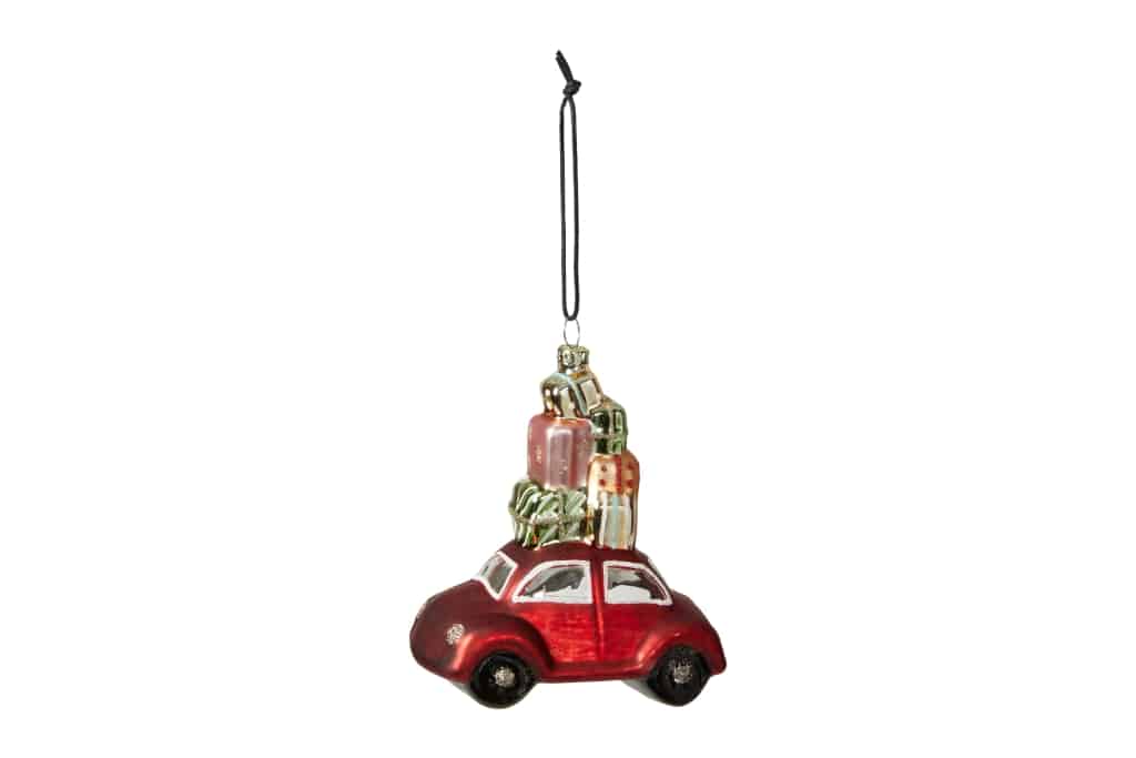 Julekugle formet som en bil med højt læs af julegaver på taget. Figurkugler gør juletræet endnu mere spændende.Mål:Længde: 6 cmBredde: 11 cmHøjde: 13 cmFremstillet af glas.Pakket med 1 stk.