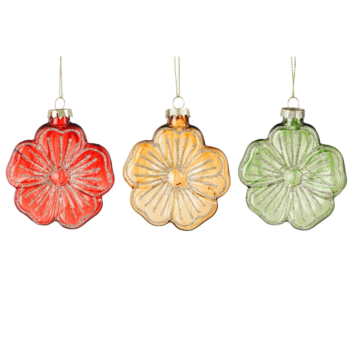 Farvestrålende, blomsterformede julekugler i glas med fine detaljer i guldfarvet glimmer. Julekuglerne findes i farverne; rød, grøn eller guldfarvet. I samme farvenuance fås også hjerteformede julekugler.Mål:Diameter: 8 cmTykkelse: 2 cmFremstillet i glas