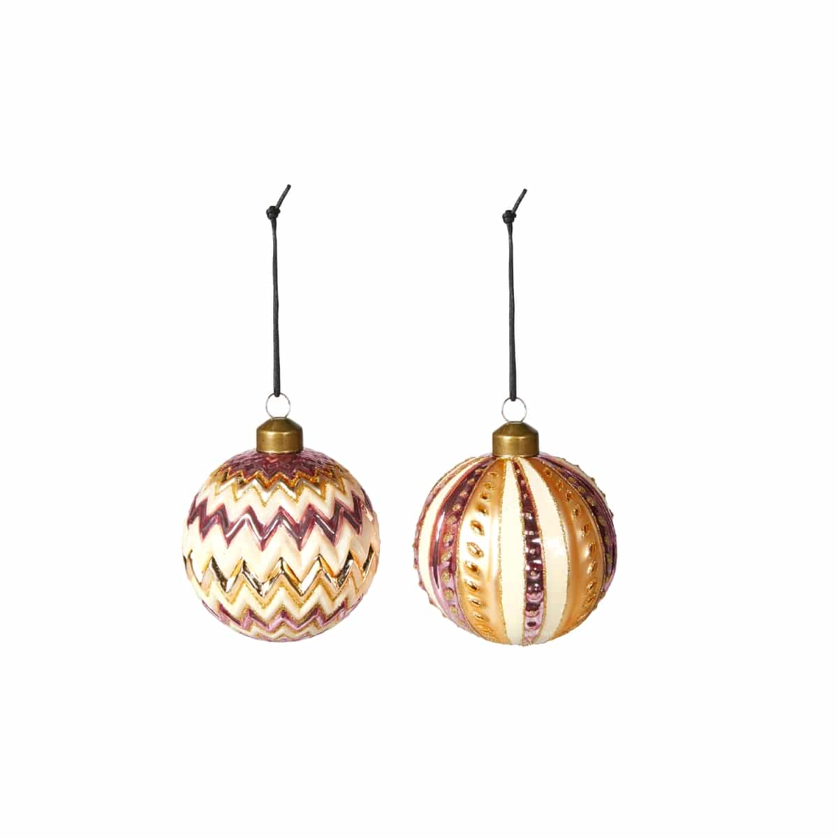 Julekugler med mønstre i farverne bordeaux, guld og hvid. Vælg mellem med zigzag-mønster eller med striber. Flotte på juletræet eller som pynt på fx et lysfad. Julekuglerne er fra Speedtsberg julekollektion.Mål:Diameter: 8 cmFremstillet i glas.Pakket med