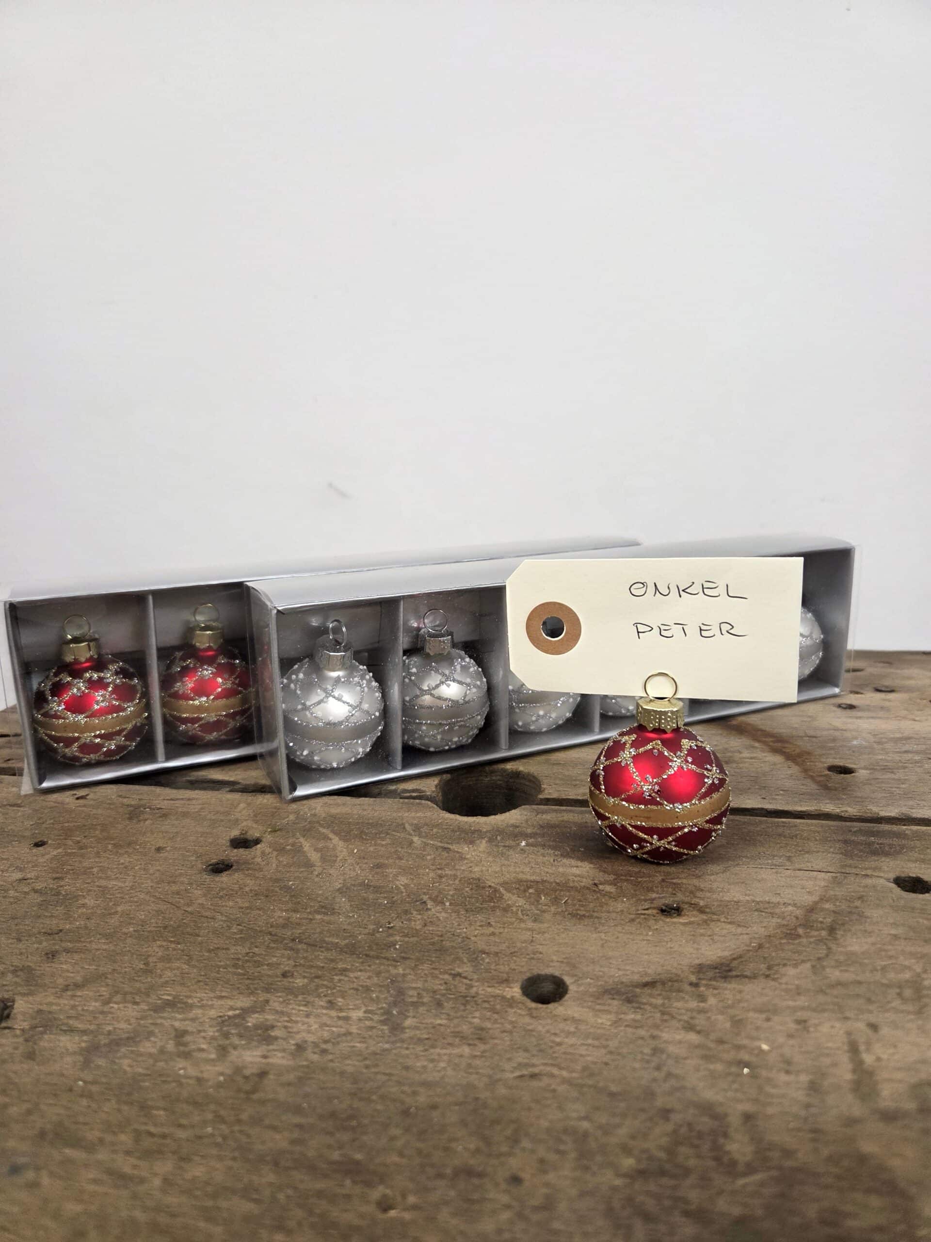 Disse søde julekugler er perfekte til at holde bordkortene på plads og gøre din julemiddag lidt mere festlig. De findes i smuk rød, sølv eller hvidguld med fint glitter og elegant mønster og de er bare 4 cm store, så de er diskrete, men alligevel iøjnefa