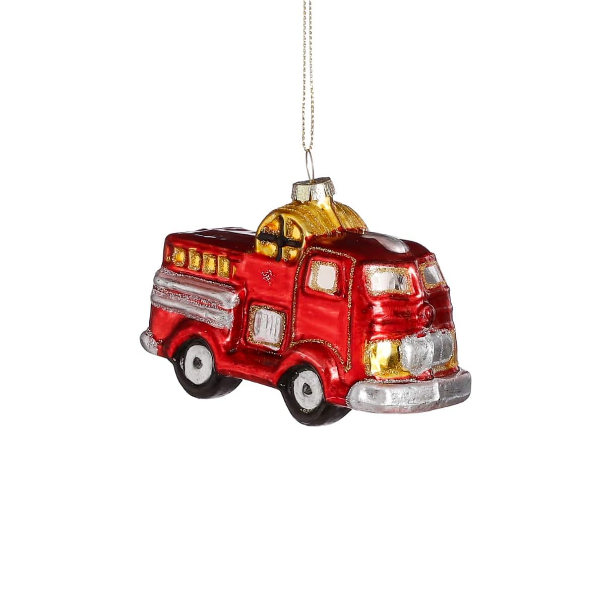 Julekugle Brandbil i rød med guldfarvet slangeoprul og sølvfarvede ruder. Mål:Længde: 10,5 cmDybde: 5,5 cmHøjde: 7,5 cmFremstillet i glas.Pakket med 1 stk.