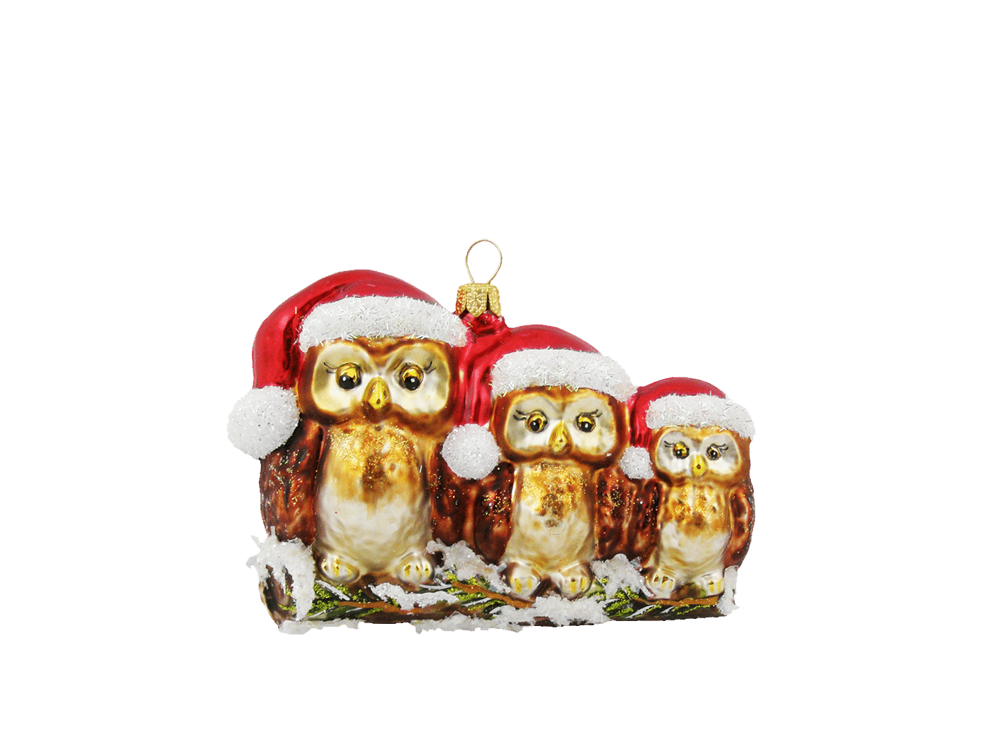 Detaljerig julekugle, der forestiller tre brune ugler på en gren. Julekuglen er mundblæst og håndmalet hos det østrigske glaspusteri Hanco. Figurkugler på grene og juletræer er skønne blikfang mellem de klassiske julekugler.Mål:Bredde: 11 cmHøjde: 6 cmFre