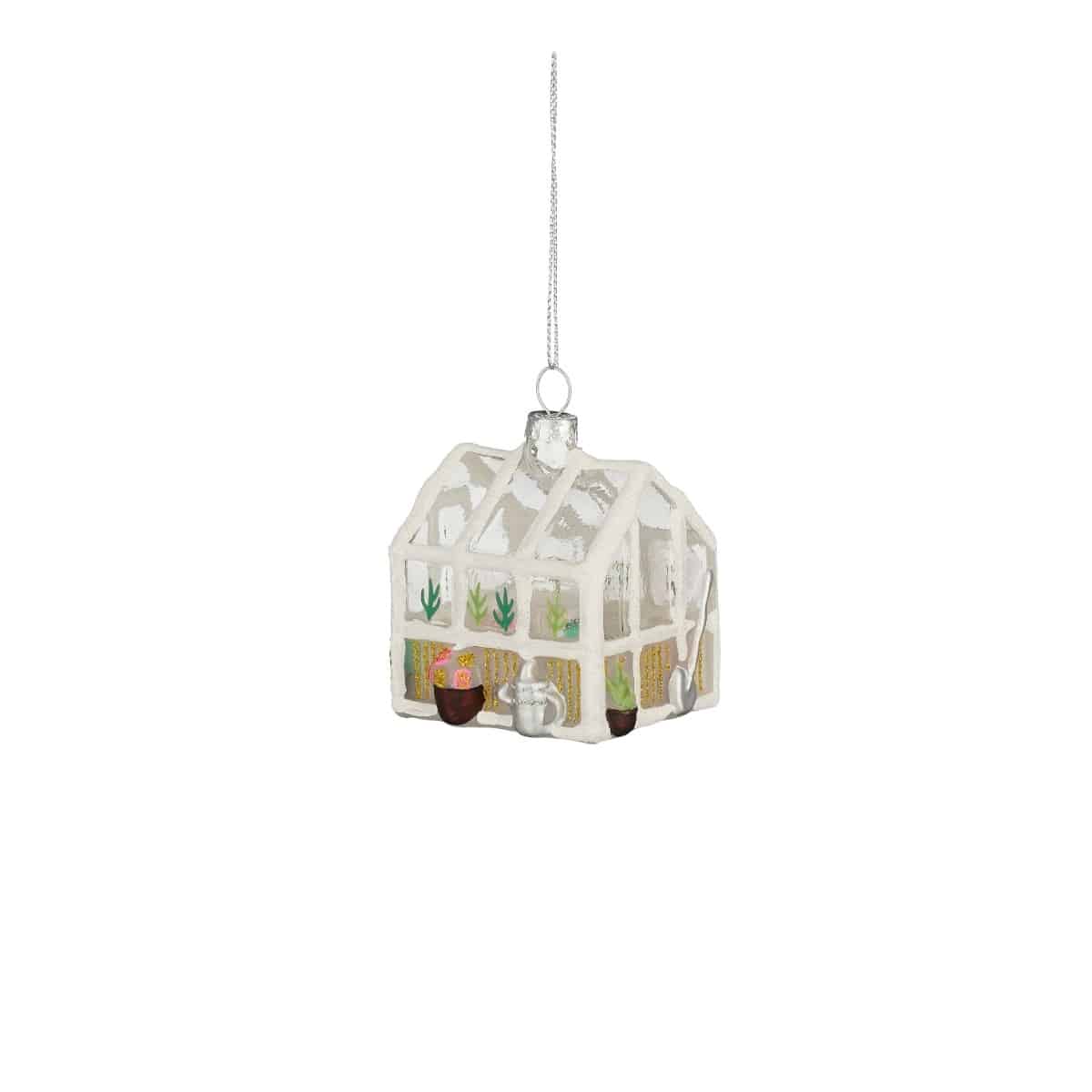 Julekugle formet som drivhus i klart glas med hvide profiller, haveredskaber og vækster. Fin som pynt på juletræet eller en sød gaveidé til de haveglade.Mål:Længde: 6,5 cmBredde: 6 cmHøjde: 7 cmFremstillet af glas.Pakket med 1 stk.