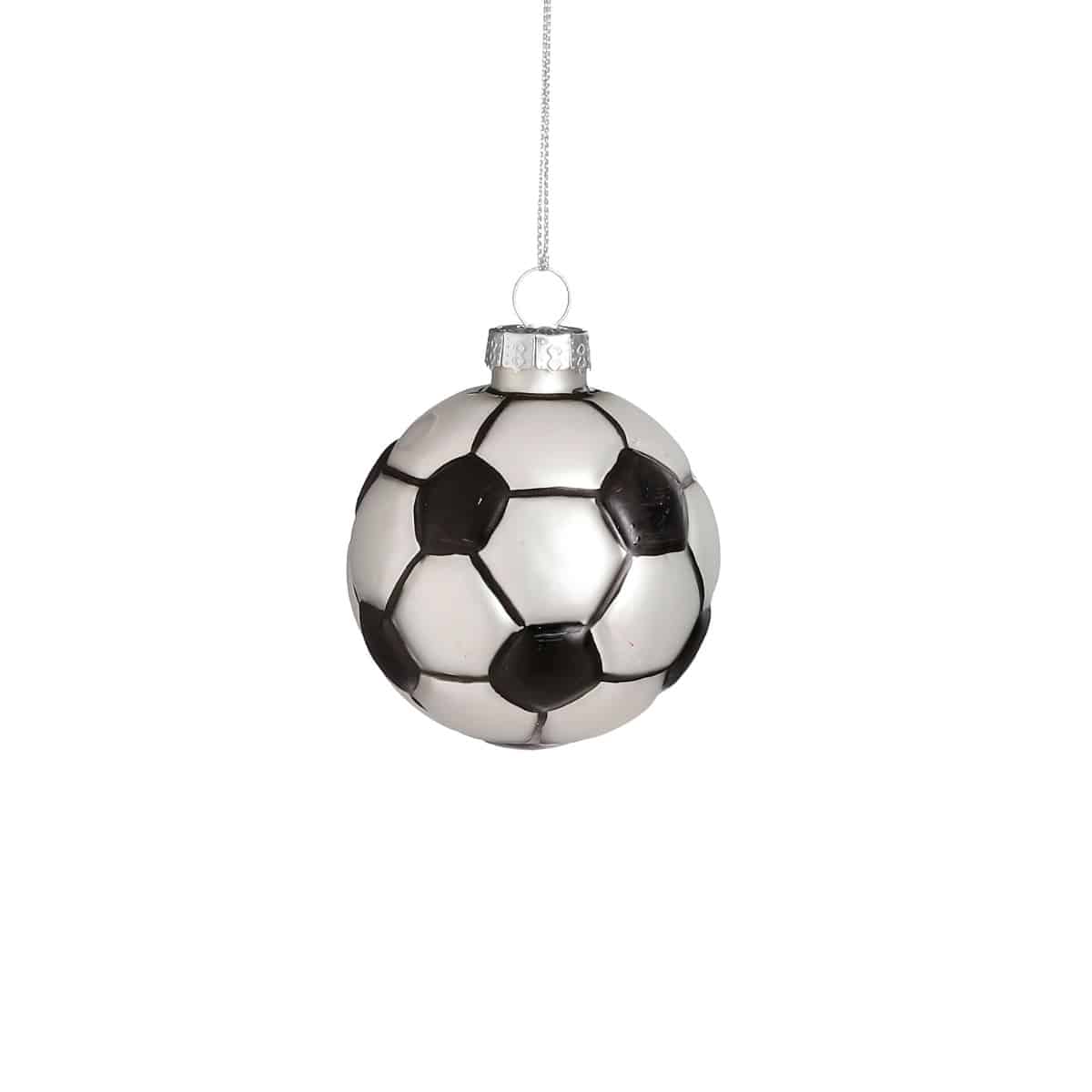 Figurjulekugle, der forestiller en fodbold med sorte og sølvfarvede felter. Figurkugler som juletræspynt er skønne og sjove blikfang mellem de klassiske julekugler. Julefigurkuglerne er lette at hænge på træet og kan også bruges i kranse, som bordpynt ell