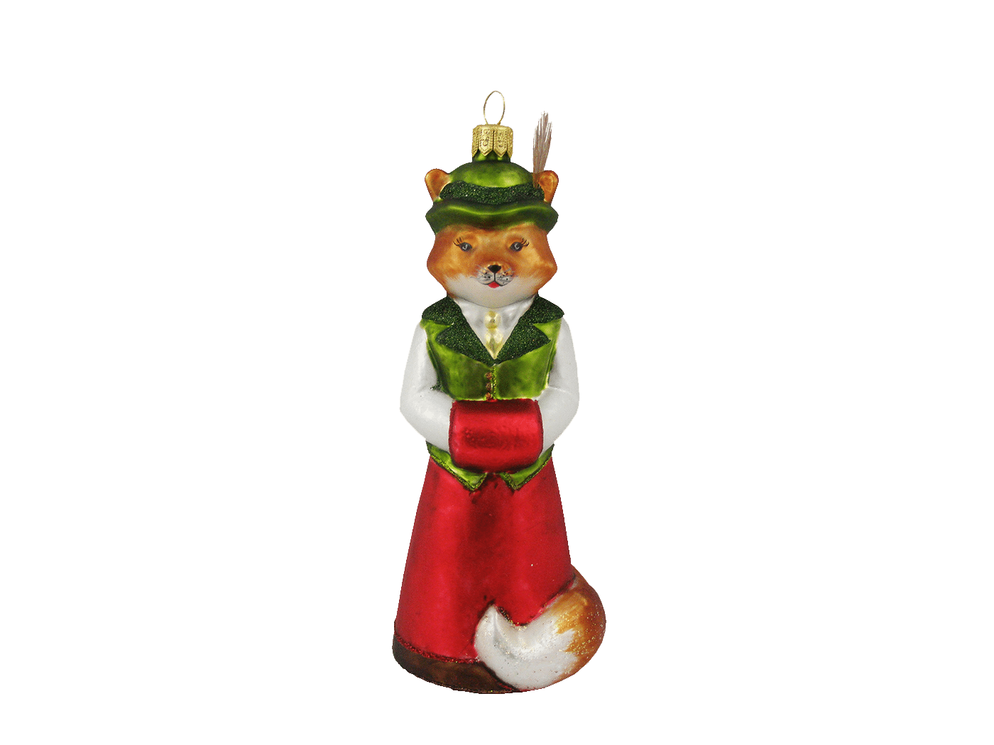 Detaljerig julekugle, der forestiller fru Ræv i fine klæder og med rød muffe. Julekuglen er mundblæst og håndmalet hos det østrigske glaspusteri Hanco. Figurkugler på grene og juletræer er skønne blikfang mellem de klassiske julekugler.Mål:Højde: 14 cmFre