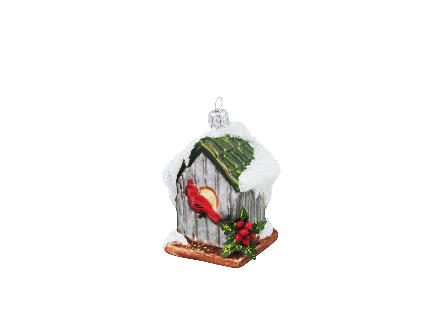 Julekugle Fuglehus er fremstillet i glas. Fuglehuset er i hvidt med grønt tag med sne på. En lille rød fugl sidder ved fuglehuset. Fuglehuset måler 7 cm i højden.Pakket med 1 stk.