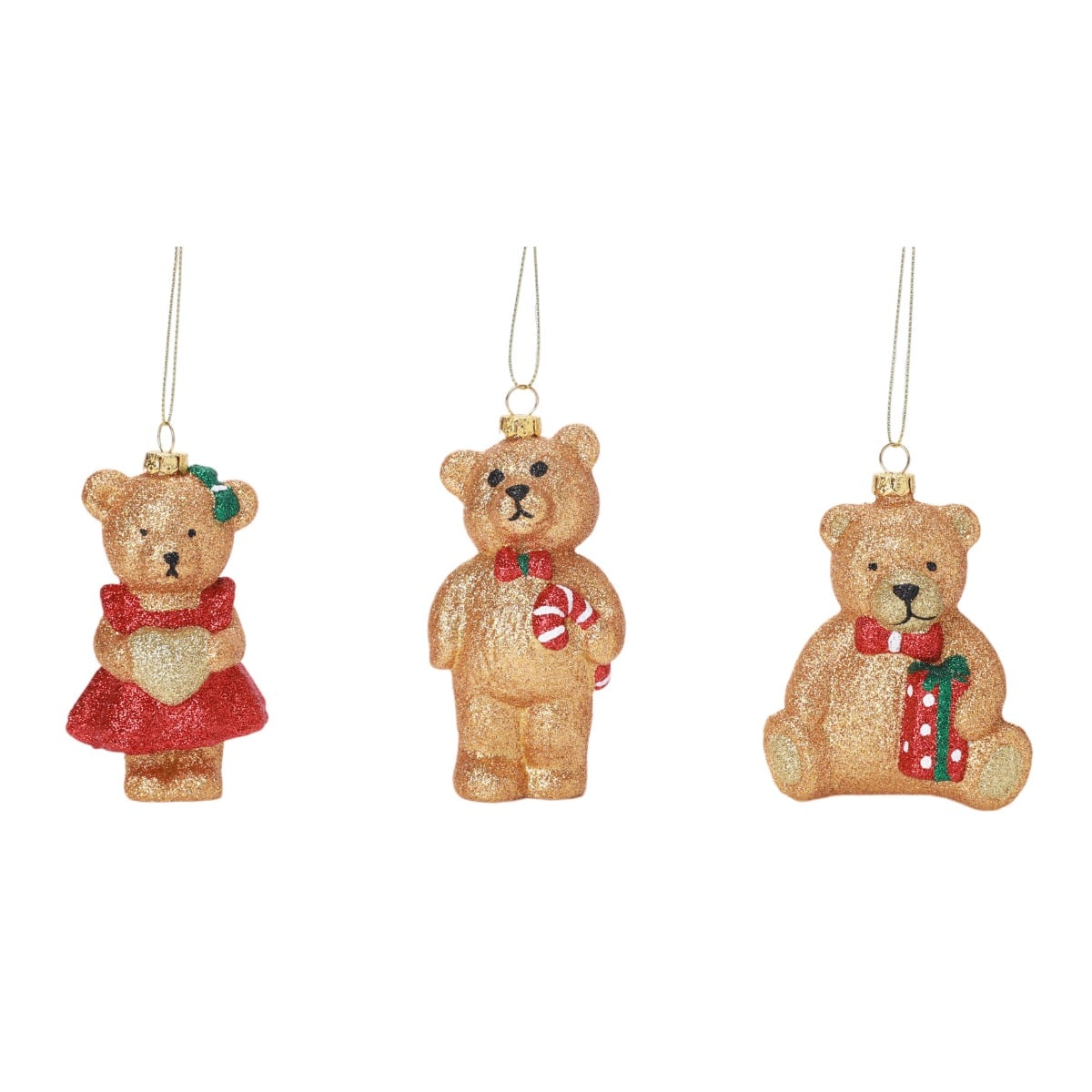 Julekugler formet som bamsebjørne med julepynt i poterne. Julebjørnene er i glimtende glitter og pynter flot på grene, juletræer, i vinduet mv. Vælg mellem tre forskellige.Mål:Højde: 12 cmFremstillet af glas mv.Pakket med 1 stk.