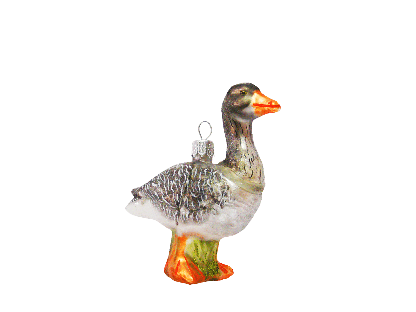 Julekugle Grå gås er fremstillet i ægte glas fra et østrigsk glaspusteri ved navn Hanco. Den stående grå gås er med flot fjerstruktur på vingerne. Gåsen måler 9,8 cm i højden.Pakket med 1 stk.