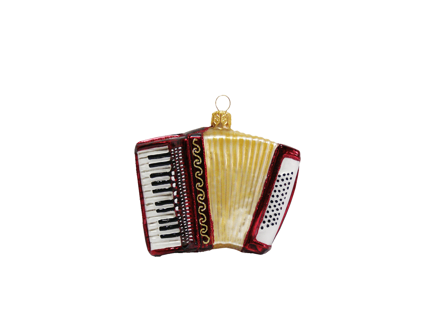 Detaljerig julekugle, der forestiller en rødbrun harmonika med tangenter. Julekuglen er mundblæst og håndmalet hos det østrigske glaspusteri Hanco. Figurkugler på grene og juletræer er skønne blikfang mellem de klassiske julekugler.Mål:Højde: 7 cmFremstil