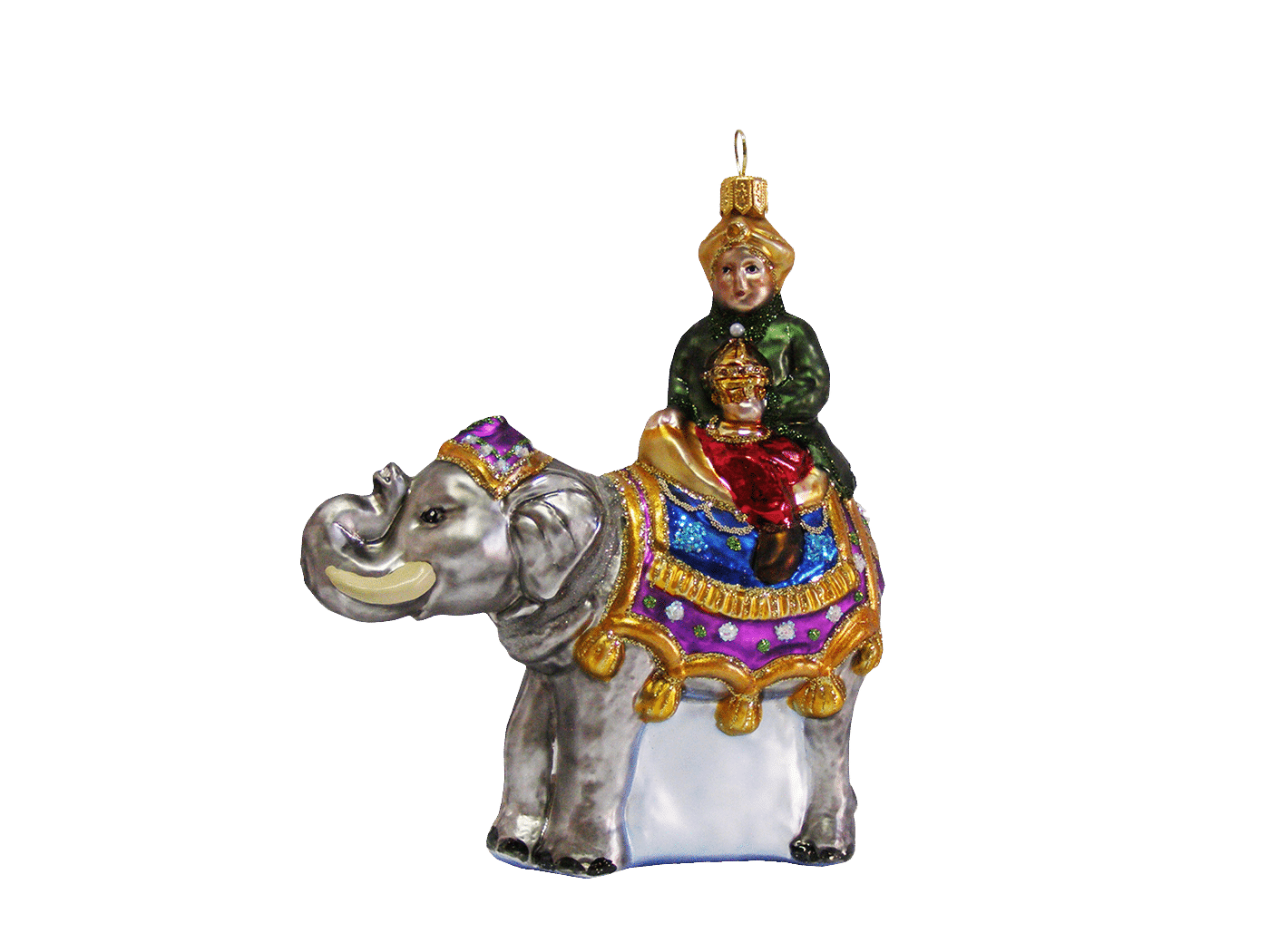 Detaljerig julekugle, der forestiller den ene af de Hellige tre Konger: Melchior. Melchior er ridende på elefantryg i farvestrålende tøj og med sadeltæppe med mønster. Julekuglen er mundblæst og håndmalet hos det østrigske glaspusteri Hanco. Figurkugler p