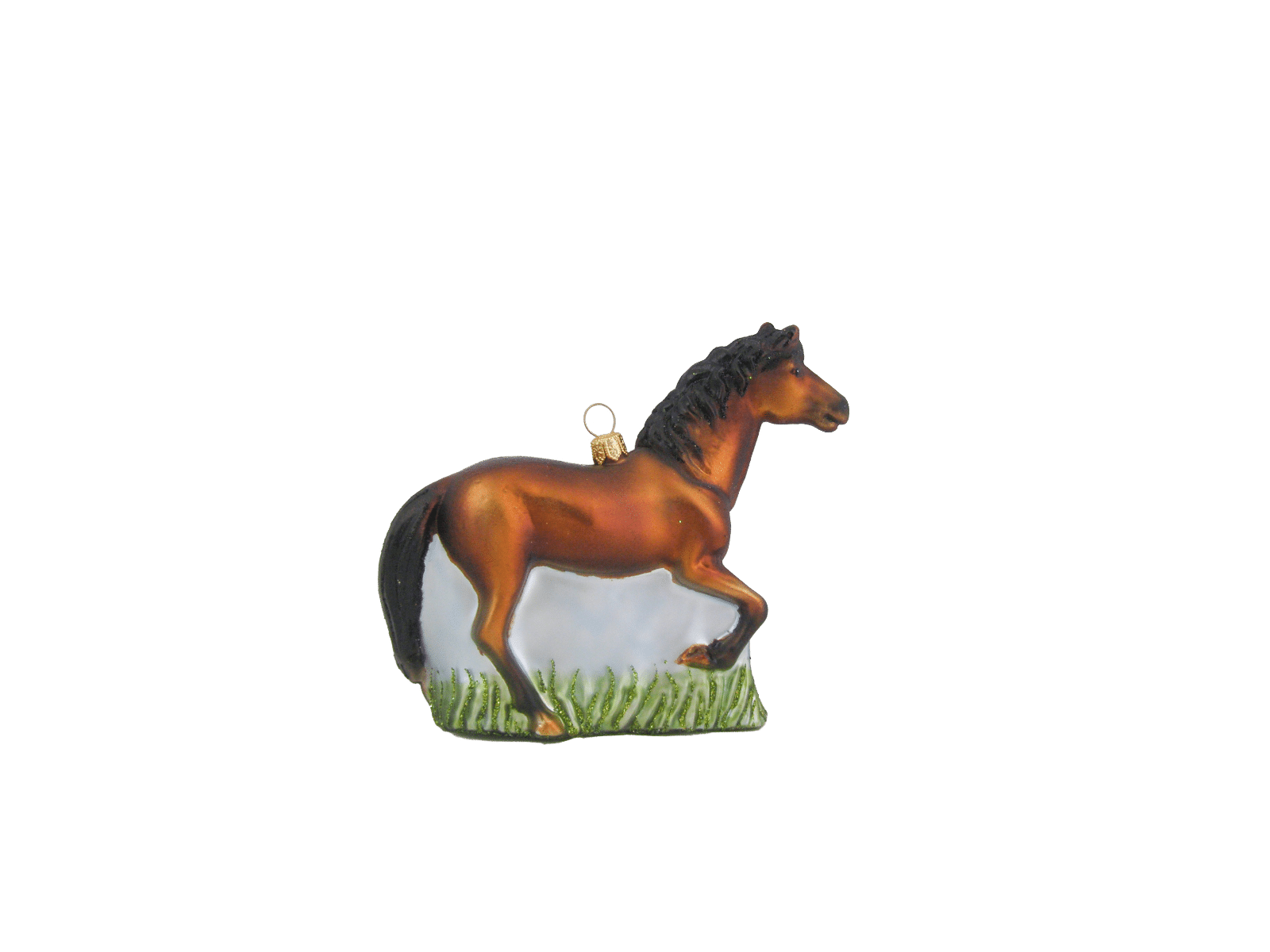 Detaljerig julekugle, der forestiller en brun hest på græs. Julekuglen er mundblæst og håndmalet hos det østrigske glaspusteri Hanco. Figurkugler på grene og juletræer er skønne blikfang mellem de klassiske julekugler.Mål:Højde: 11,5 cmFremstillet af glas