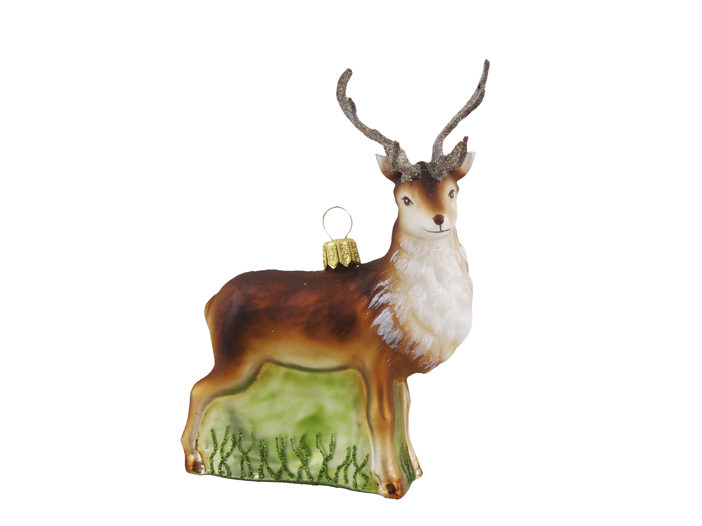 Detaljerig julekugle, der forestiller en hjort med flot gevir. Hjorten står på et lille stykke grøn græseng. Julekuglen er mundblæst og håndmalet hos det østrigske glaspusteri Hanco. Figurkugler på grene og juletræer er skønne blikfang mellem de klassiske