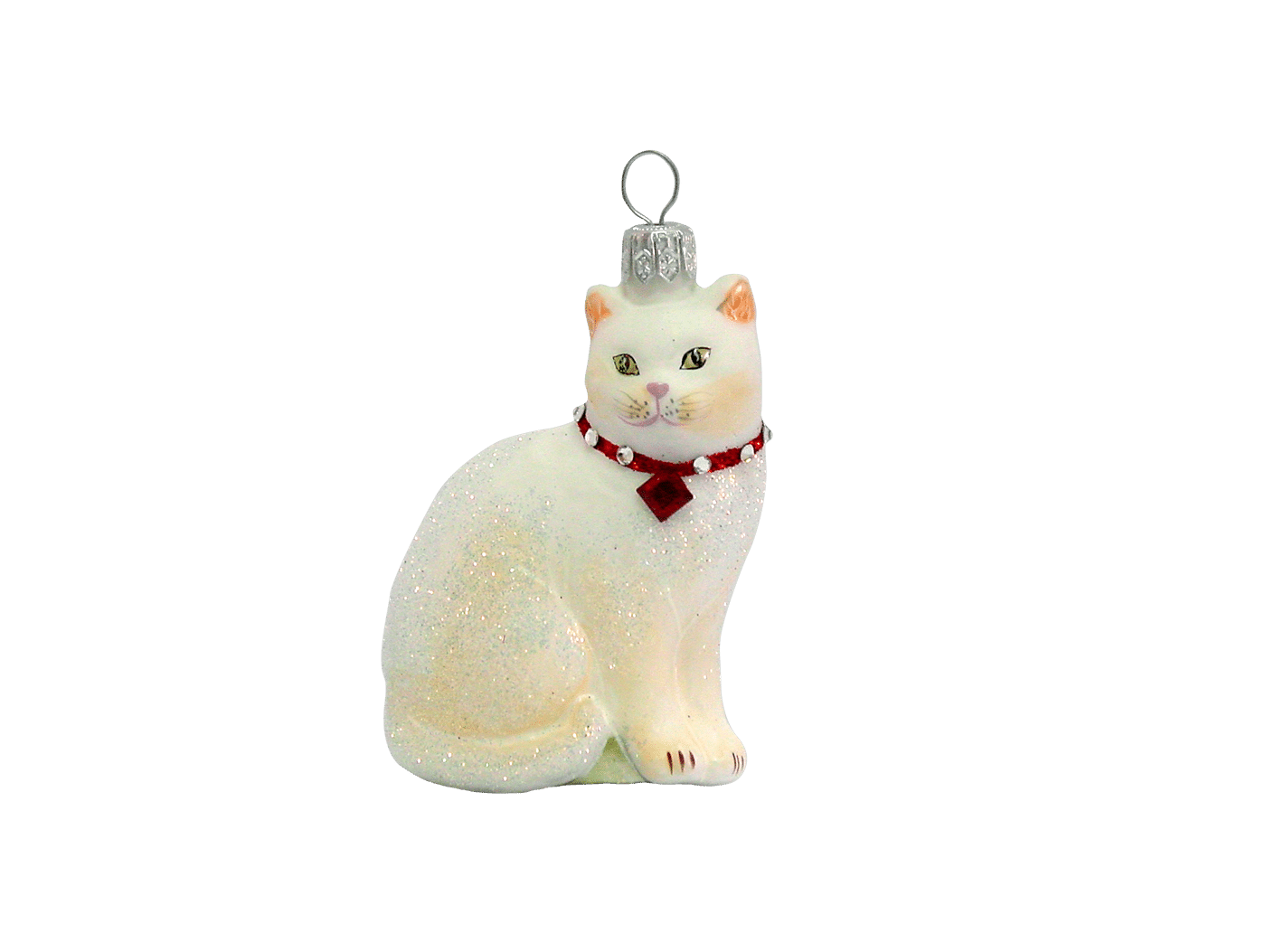 Detaljerig julekugle, der forestiller en hvid kat med let glimmer på pelsen og bærerende et rødt halsbånd med vedhæng. Julekuglen er mundblæst og håndmalet hos det østrigske glaspusteri Hanco. Figurkugler på grene og juletræer er skønne blikfang mellem de