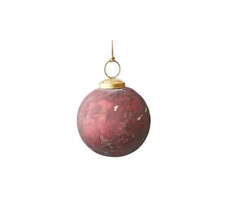 Julekugle i glas i et antikt design af bordeaux og med diameter på 7,5 cm.