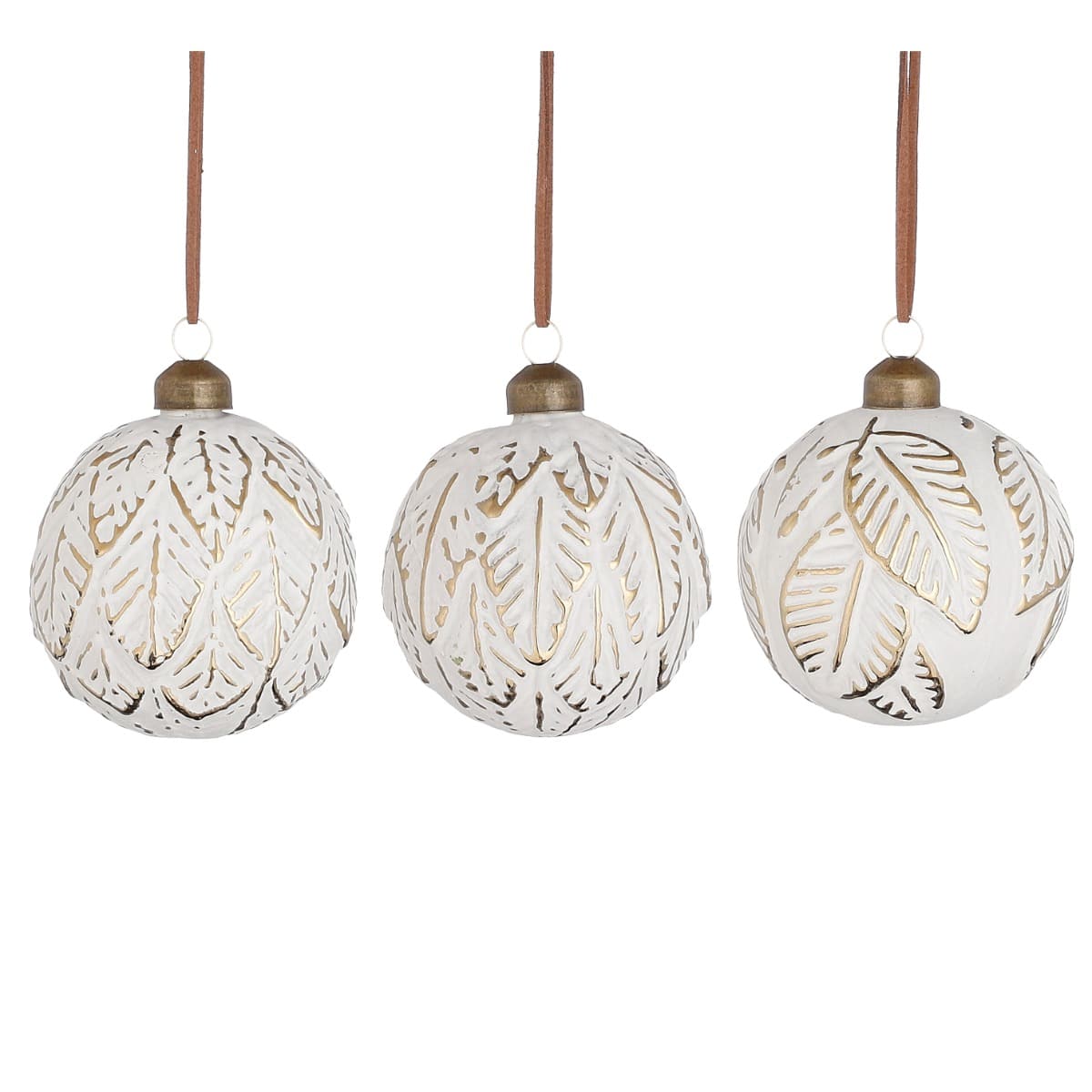 Flotte rustikke julekugler i mat hvid med guldfarvet bladmønster på. Julekuglerne findes i 3 forskellige varianter alle med bladmønster. Mål:Diameter: 8 cmFremstillet i glas.Pakket med 1 stk.