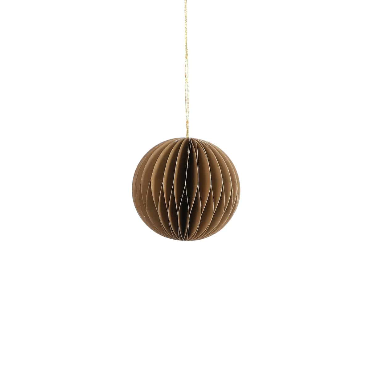 Julekugle i guldfarvet papir. Julekuglen er fremstillet i genbrugspapir. Den foldes ud og lukkes med en lille magnet. Der er snor i julekuglen. Findes i mange former og farver.Mål:Diameter: 8 cmFremstillet i genanvendt papir. Pakket med 1 stk.