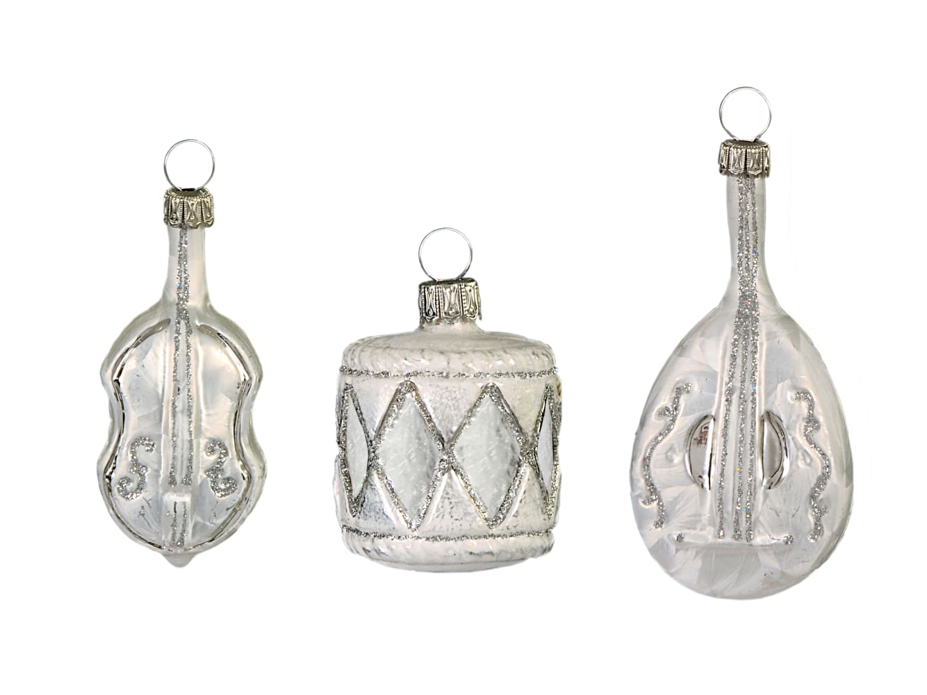 Smukke julekugler formet som instrumenter i mat hvid med sølvfarvede detaljer. Julekuglerne er mundblæste og håndmalede hos det sydtyske glaspusteri Thüringer Weinacht.Mål:Højde: ca. 5 cmFremstillet af glas.Pakket med 3 stk. i en æske.