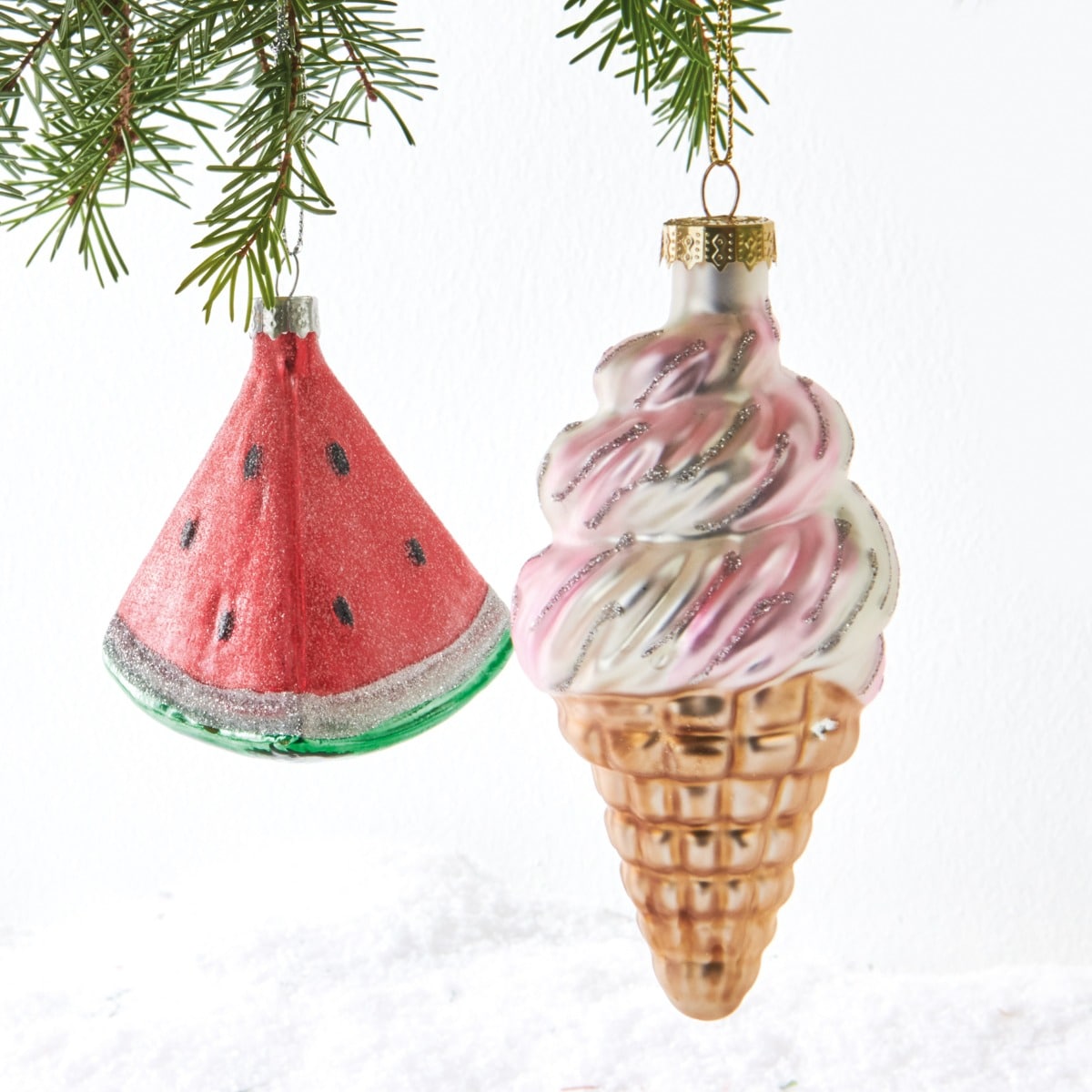 Julekugler formet som et stykke med vandmelon eller en isvaffel. Begge pyntet med let glimmer. Festlige som blikfang på juletræet. Mål:Højde: 8 og 12 cmFremstillet af glas.Pakket med 1 stk.