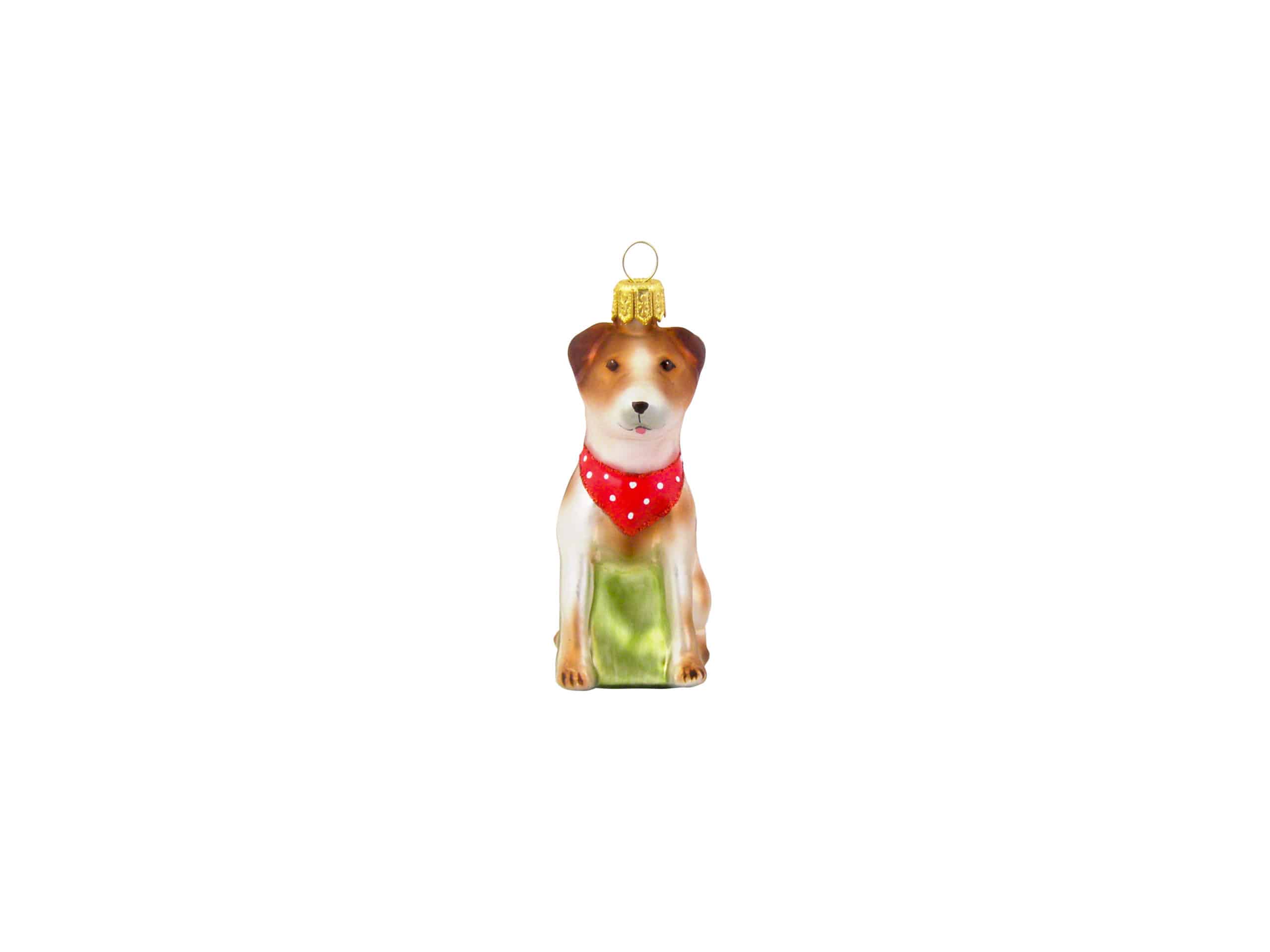 Detaljerig julekugle, der forestiller en siddende Jack Russell terrier med rødt tørklæde med hvide prikker på. Julekuglen er mundblæst og håndmalet hos det østrigske glaspusteri Hanco. Figurkugler på grene og juletræer er skønne blikfang mellem de klassis