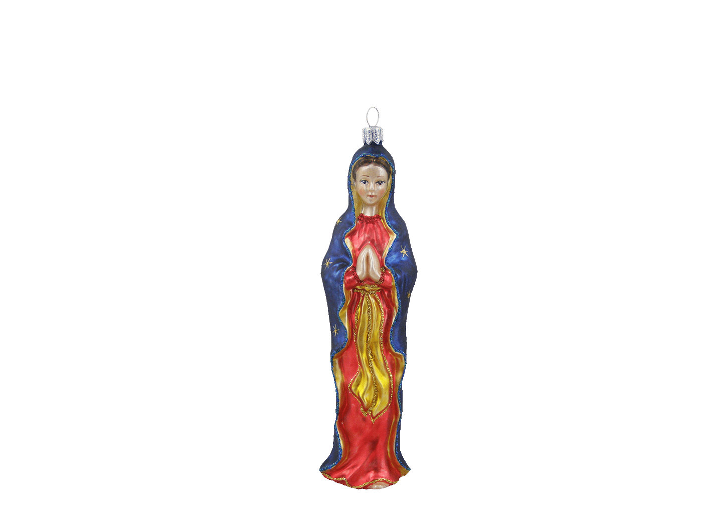 Detaljerig julekugle, der forestiller Jomfru Maria. Hun er i rød kjole med guldfarvet bånd om maven og blå kappe. Hun står med foldede hænder. Julekuglen er mundblæst og håndmalet hos det østrigske glaspusteri Hanco. Figurkugler på grene og juletræer er s