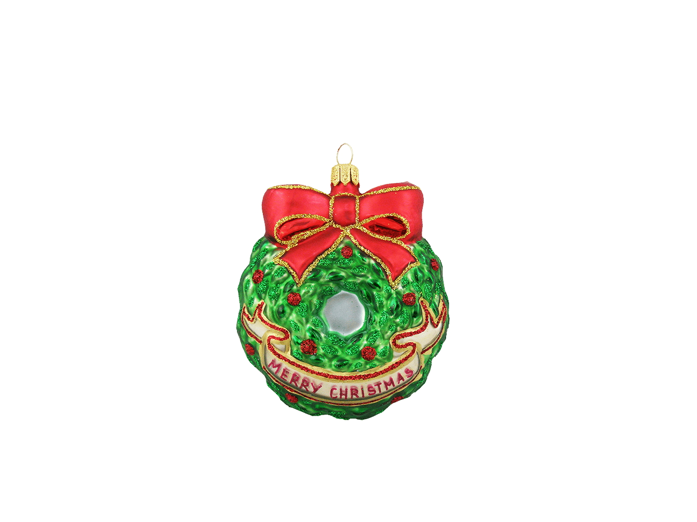 Julekugle Julekrans er fremstillet i ægte glas fra et østrigsk glaspusteri ved navn Hanco. Den grønne julekrans med røde bær har en stor rød og guldfarvet sløjfe foroven. Den bærer et bånd, hvorpå der står “Merry Christmas”. Julekransen måler 8,5 cm i høj