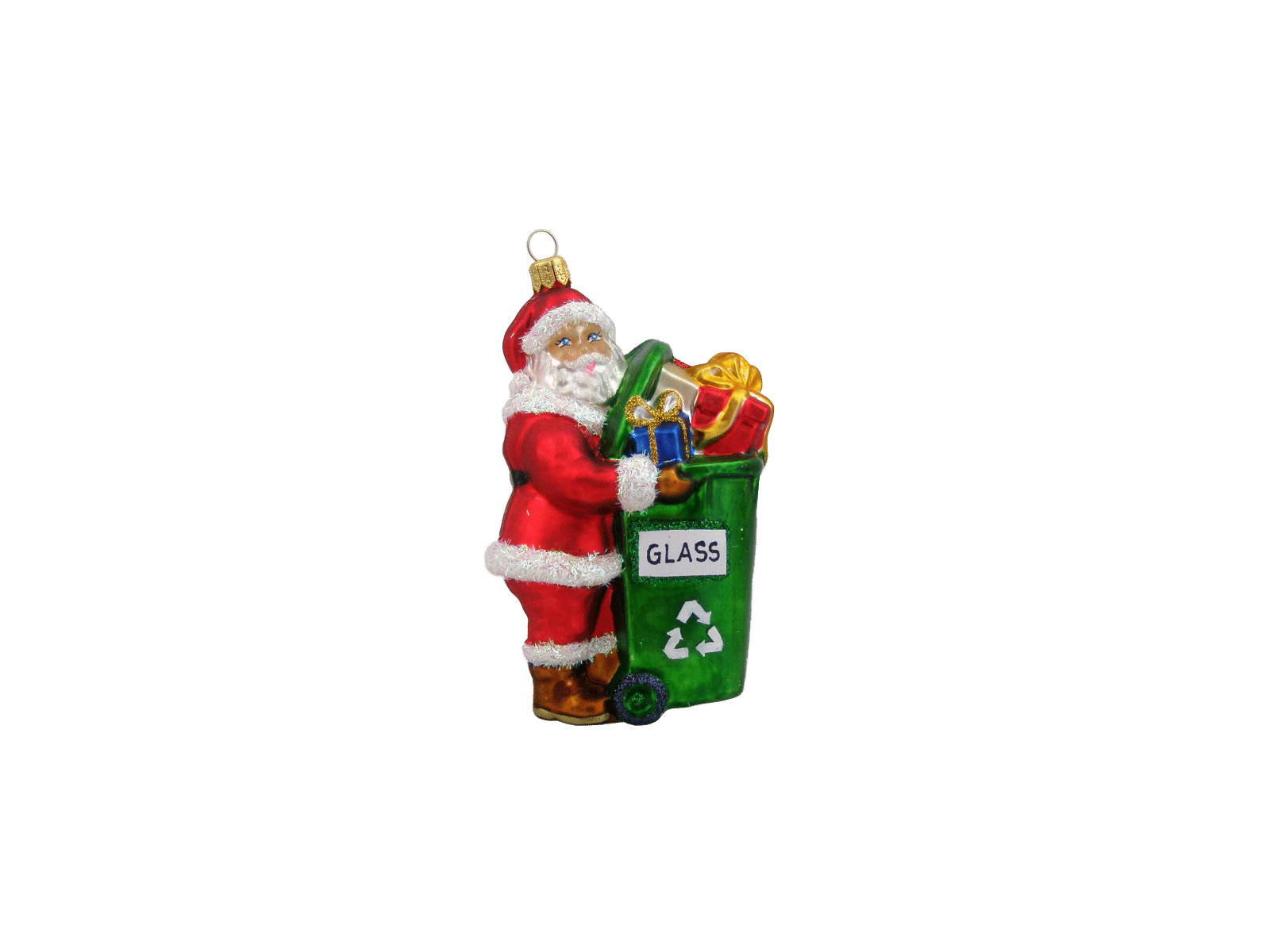 Detaljerig julekugle, der forestiller Julemanden i gang med sorteringen ved det grønne skraldespand. Julekuglen er mundblæst og håndmalet hos det østrigske glaspusteri Hanco. Figurkugler på grene og juletræer er skønne blikfang mellem de klassiske julekug