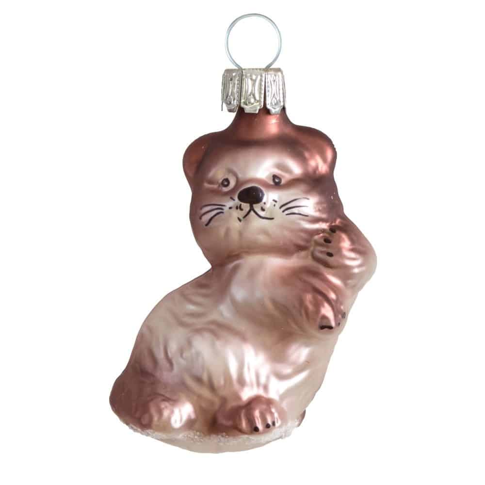 Julekugle Kattekilling brun. Brun kattekilling med mørke øjne og knurhår. Kattekillingen er mundblæst og håndmalet på Glasbläserei Thüringer Weihnacht. Måler 6 cm i højden. Fremstillet i glas. Pakket med 1 stk.