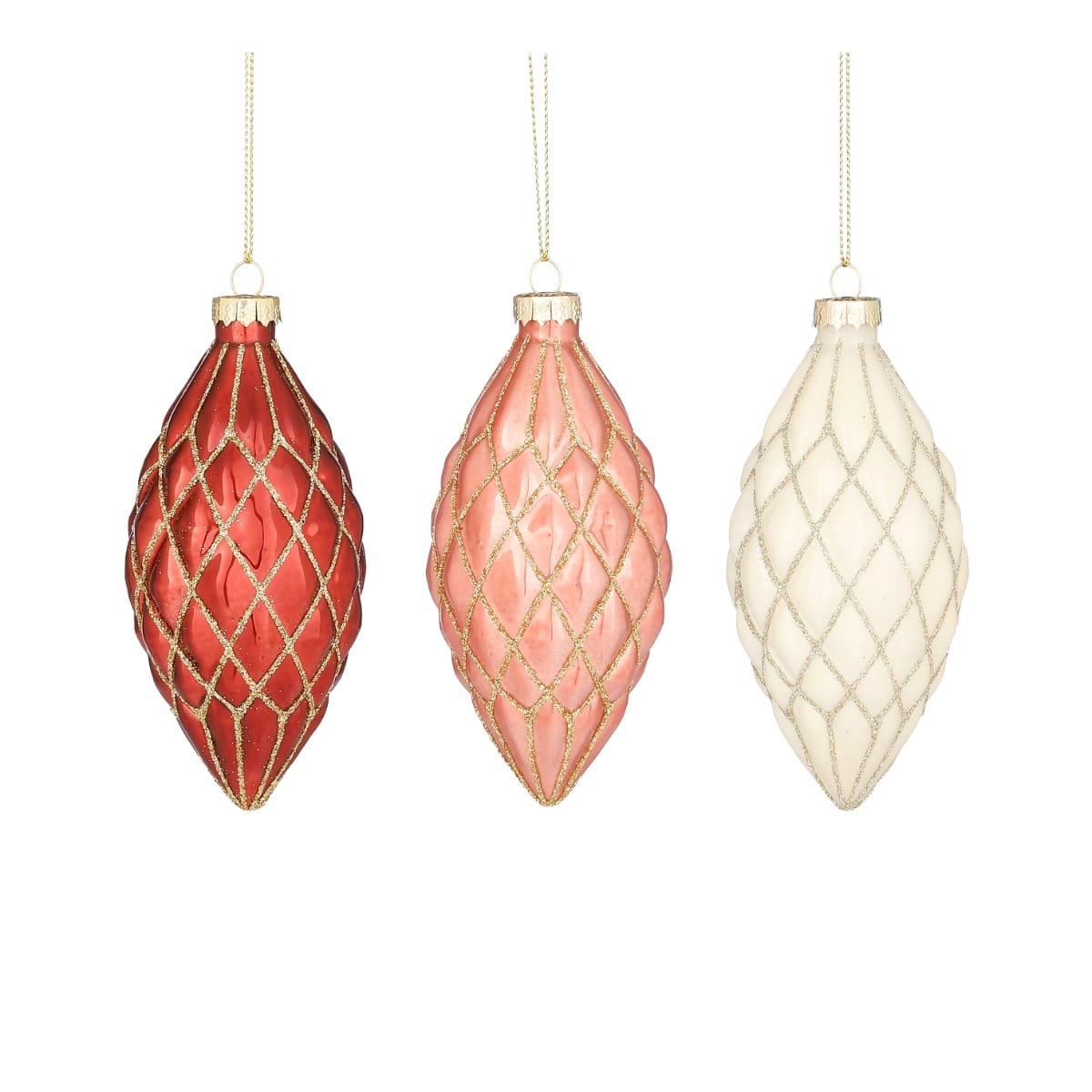 Julekugler med lang kogleform og guldfarvede, glimmerstriber, der danner et fint forhøjet, rudemønster på glasset i flotte 2022-julefarver. Vælg mellem brun, creme eller lyserød. Mål:Diameter 6 cmHøjde: 13 cmFremstillet i glas.Pakket med 1 stk.