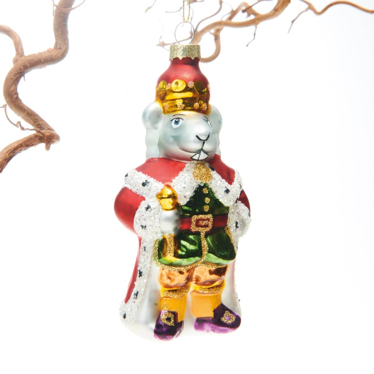 Kongelig mus med kongekrone, kåbe og scepter. En iøjnefaldende julekugle med masser af farver og detaljer lige klar til at blive hængt på juletræet.Mål:Højde: 13 cmFremstillet af glas.Pakket med 1 stk.