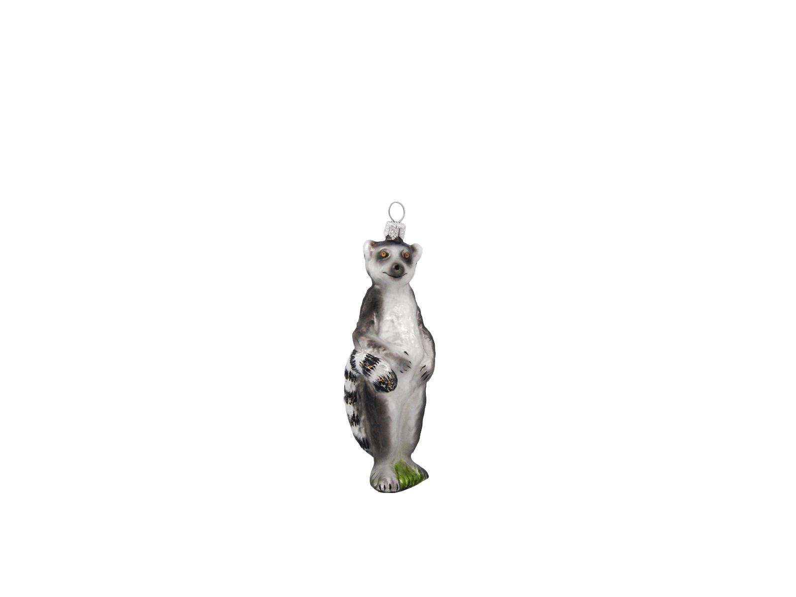 Detaljerig julekugle, der forestiller en stående lemur med tydelig pelsstruktur på halen. Julekuglen er mundblæst og håndmalet hos det østrigske glaspusteri Hanco. Figurkugler på grene og juletræer er skønne blikfang mellem de klassiske julekugler.Mål:Høj