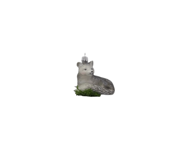 Julekugle Liggende ræv fremstillet i glas. Den liggende sølvfarvede ræv er med stor busket hale, og den ligger på lidt grønt græs. Den måler 7 cm i højden. Pakket med 1 stk.