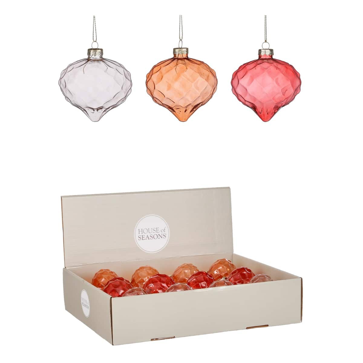 Julekugle i gennemsigtigt glas formet som et løg og med struktur i glasset. Findes i tre farver: mørkerød, orange eller klart glas. De gennemsigtige julekugler har en skøn effekt, idet man kan se igennem dem. Mål:Diameter: 8 cmHøjde: 8 cmFremstillet i gla