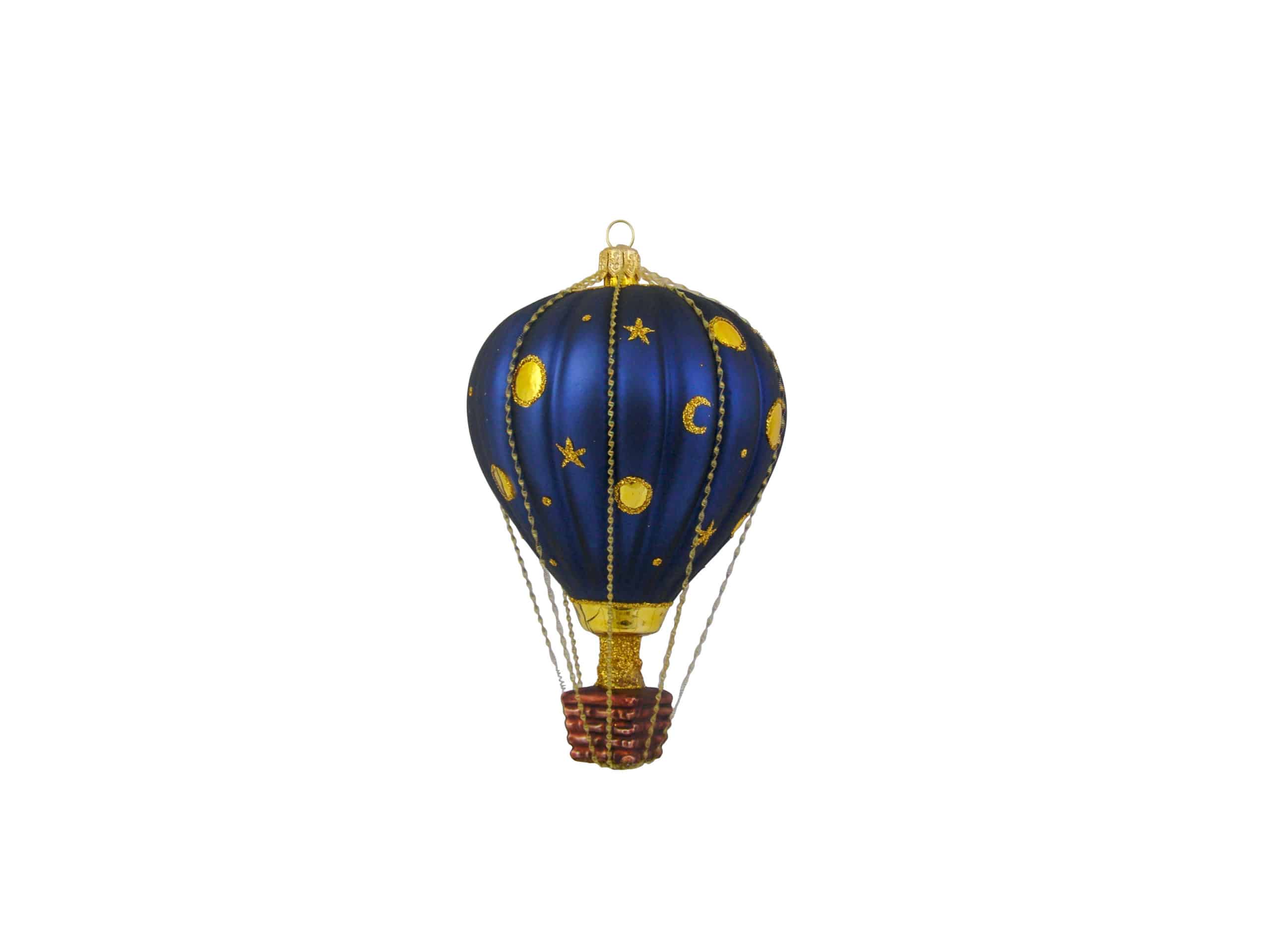 Detaljerig julekugle, der forestiller en luftballon med lille kurv og ballon i natblå med sol, måne og stjerner på. Fine tynde snore holder ballonen. Julekuglen er mundblæst og håndmalet hos det østrigske glaspusteri Hanco. Figurkugler på grene og juletræ