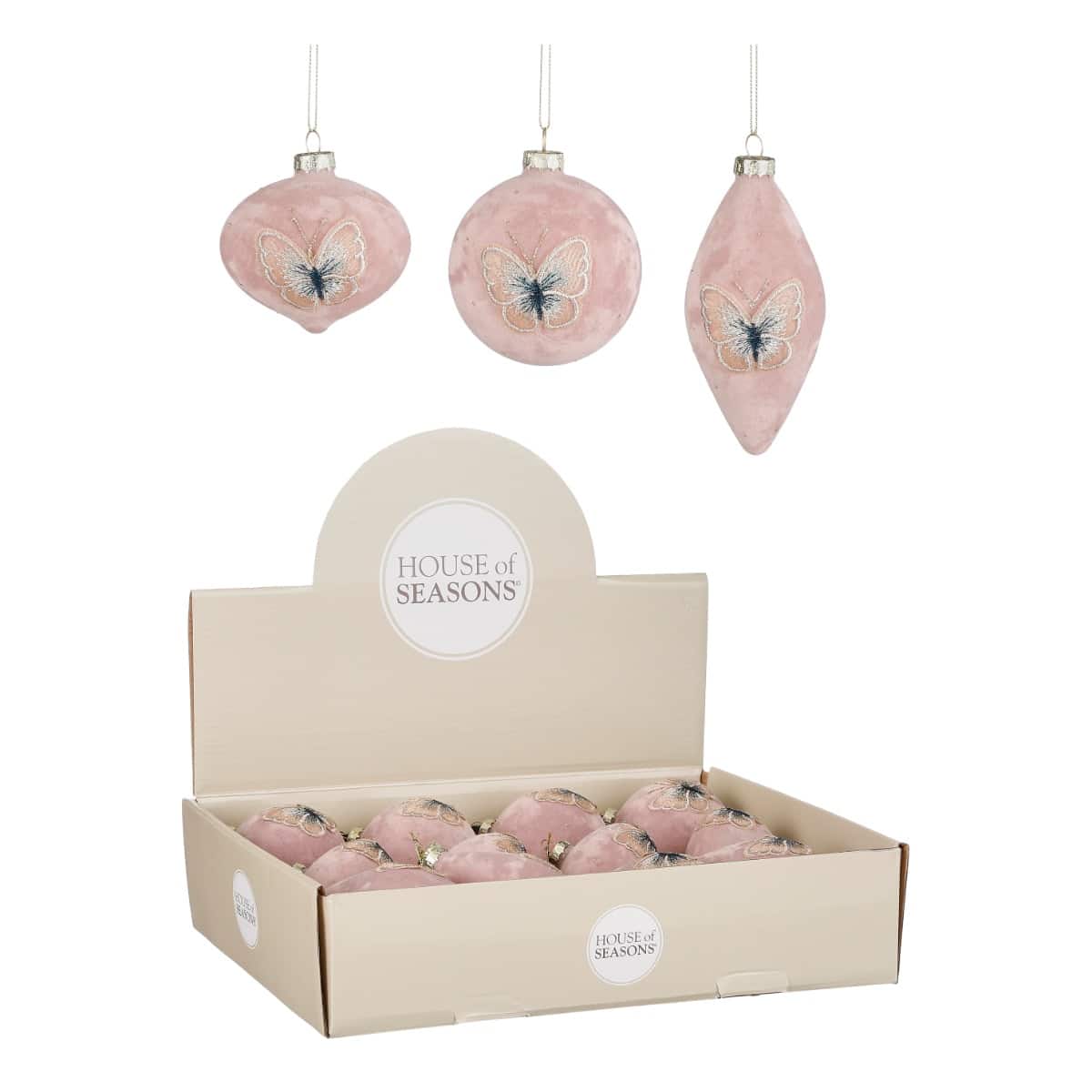 Julekugle med blød, velouragtig overflade med sommerfugl på. Julekuglen findes i 3 forskellige former. Mål:Diameter: 8 cmFremstillet i glas.Pakket med 1 stk.