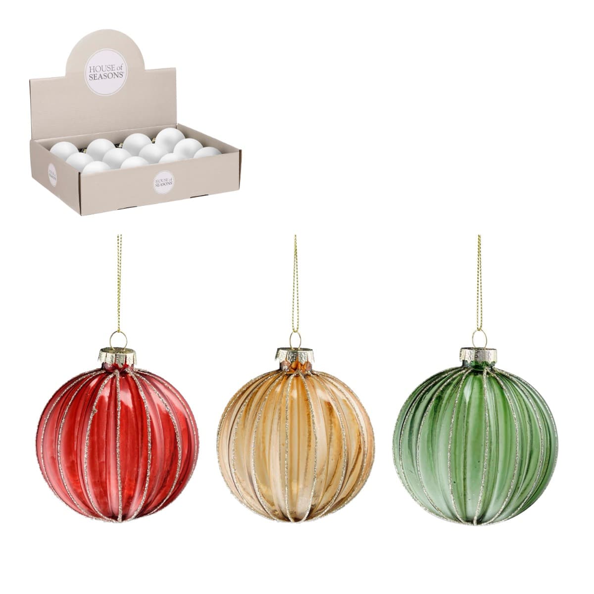 Farvestrålende, runde julekugler i glas med fine linjer i glimmer. Julekuglerne findes i farverne; rød, grøn eller guldfarvet. I samme farvenuance fås også hjerteformede og blomsterformede julekugler.Mål:Diameter: 8 cmFremstillet i glas.Pakket med 1 stk.