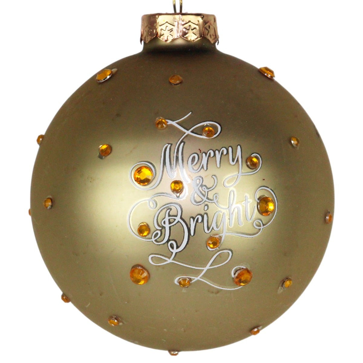Julekugle i mat guldfarvet med ravfarvede sten og hvid tekst, hvormed der er skrevet “Merry & Bright”. Mål:Diameter: 8 cmFremstillet i glas.Pakket med 1 stk.