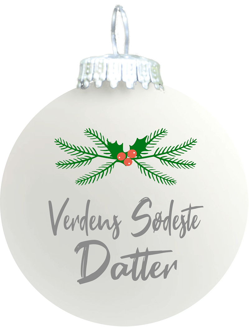 Julekugle mat hvid “Verdens sødeste Datter” fra Rolsted Copenhagen Skab en hyggelig julestemning med denne smukke julekugle fra Rolsted Copenhagen. Kuglen er lavet af glas og har en mat hvid farve med forskellige tekster trykt på den. Denne jule