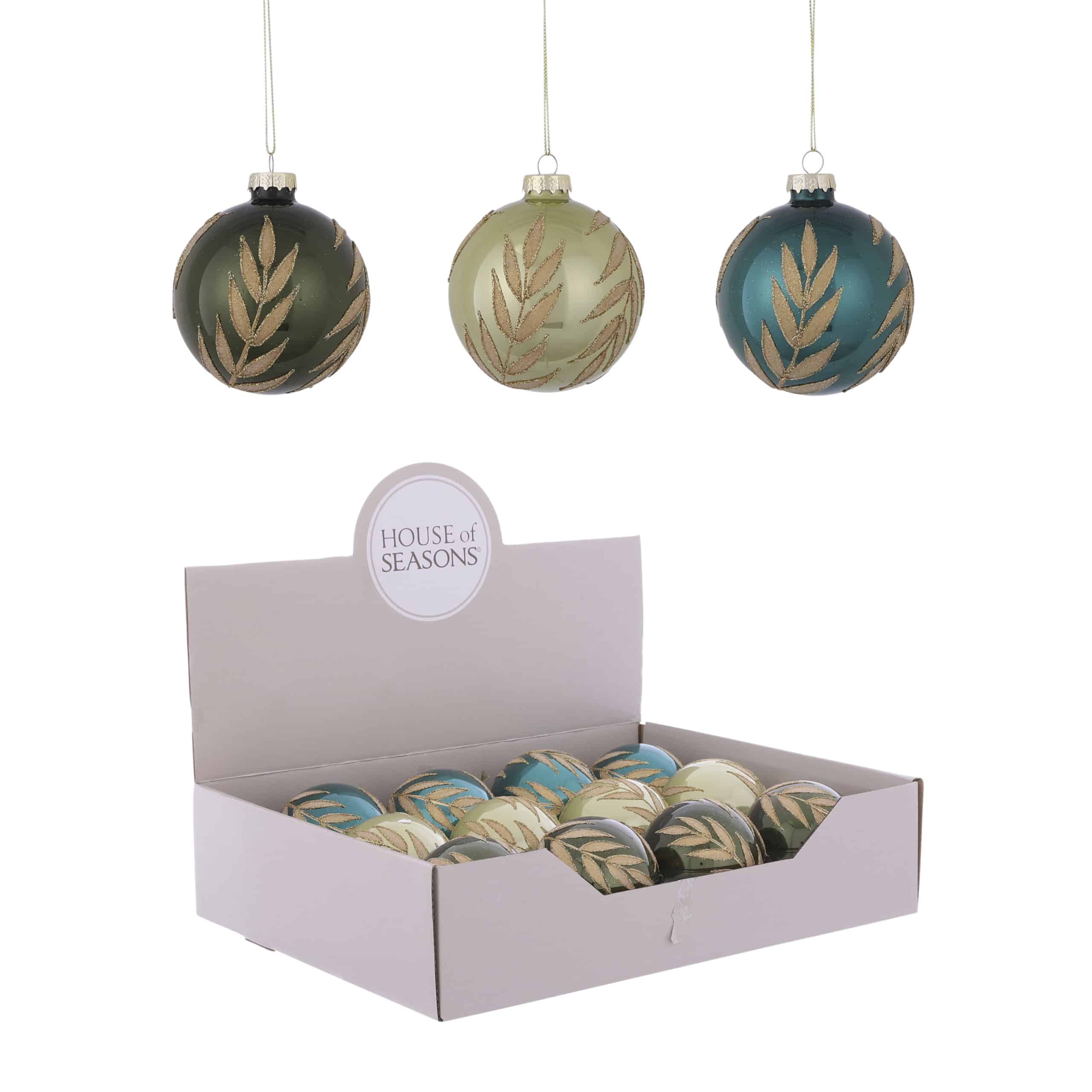 Julekugle med bladmønster i glas. Julekugle med guldglimmer bladmønster findes i 3 forskellige varianter i farverne; oliven, råhvid eller turkis. Måler: D: 8 cm Pakket med 1 stk.