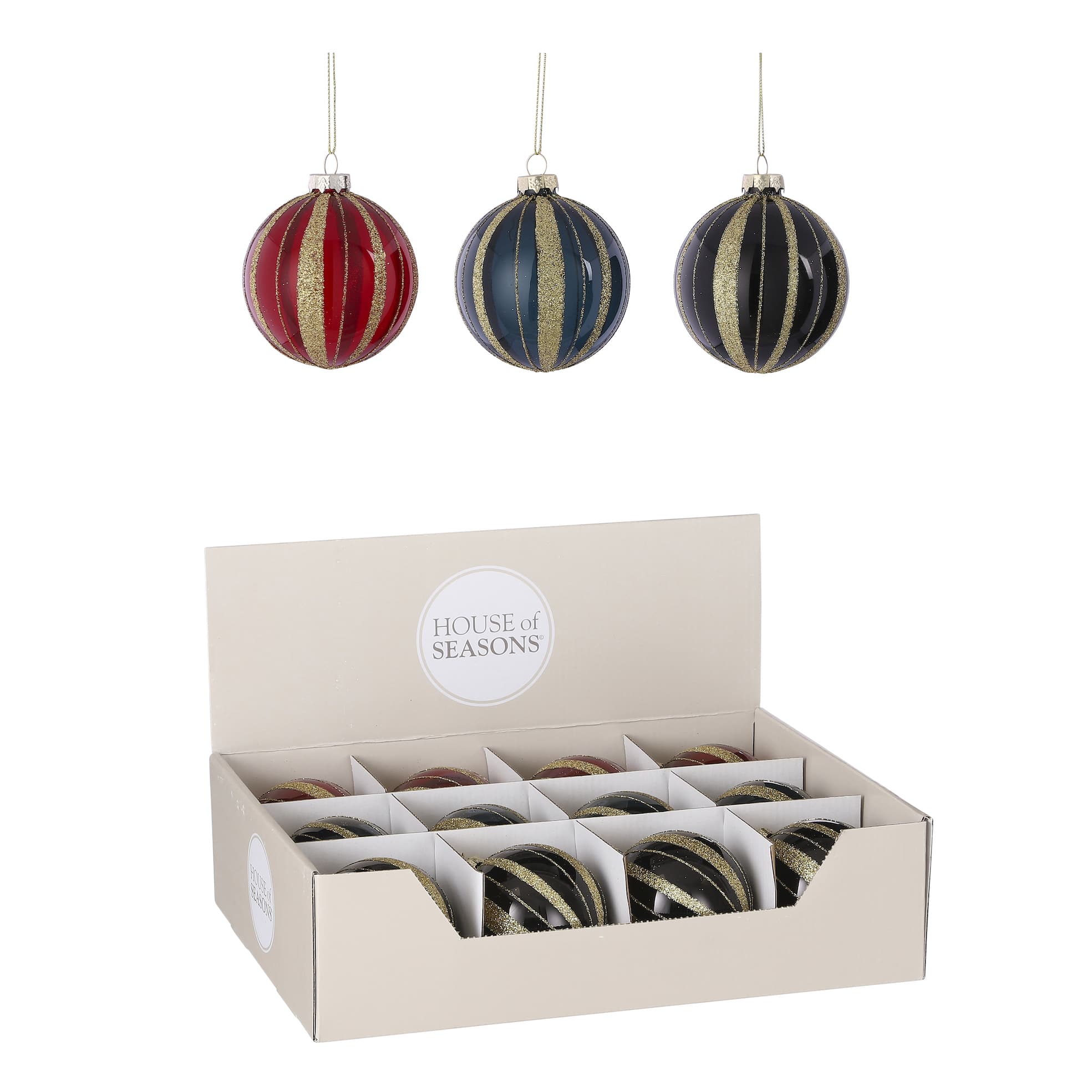 Julekugle med mønster i 3 forskellige farver: rød, blå eller sort. Julekuglerne er med fint, glimmerguldfarvet mønster. Måler 8 cm i diameter. Fremstillet i glas.Pakket med 1 stk.