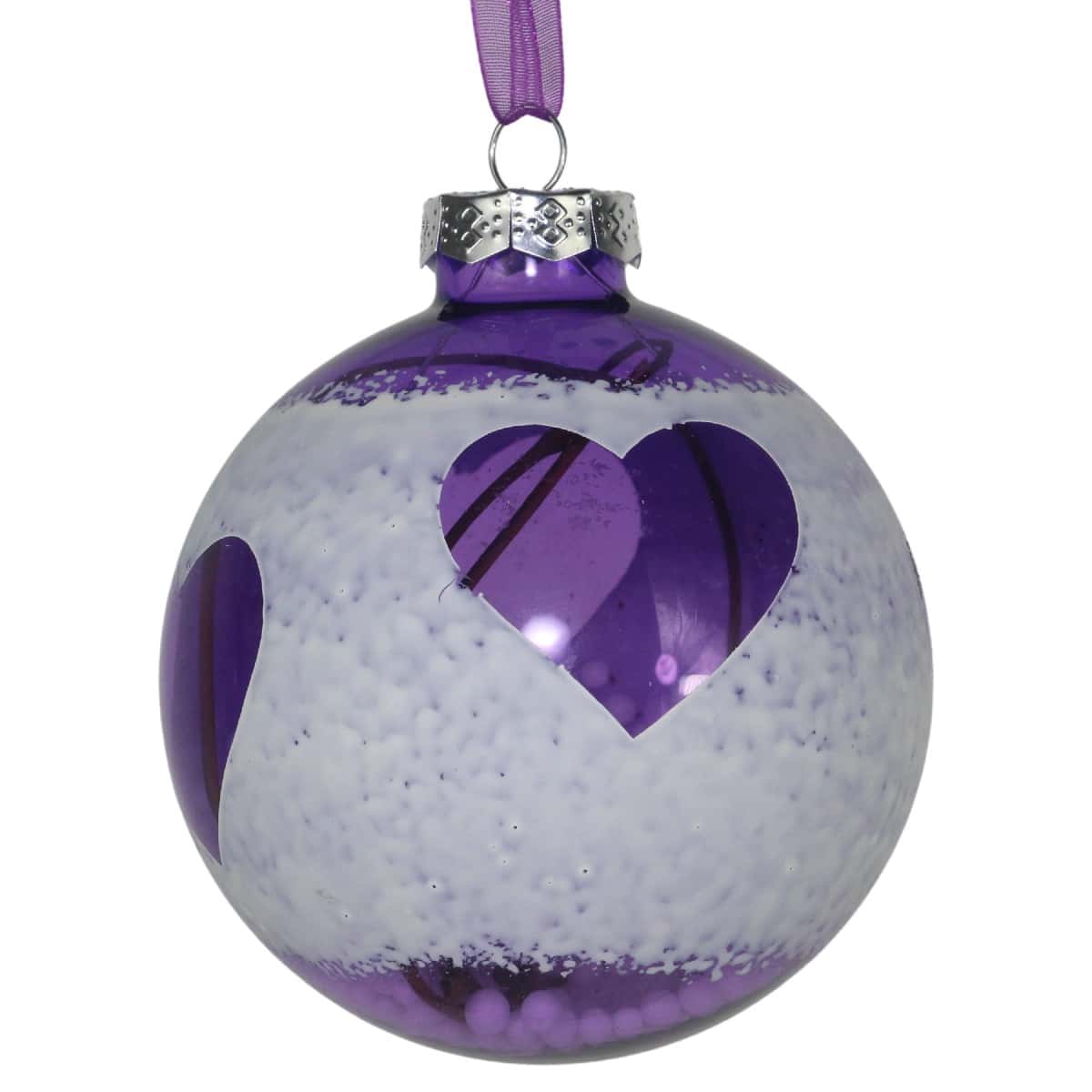 Julekugle i lilla glas med hvid snedekoration og hjertemotiv på. Indeni julekuglen er der mini-flamingokugler, små kogler og røde bær. Findes i 3 farver med forskelligt motiv. Mål:Diameter: 8 cmFremstillet i glas.Pakket med 1 stk.